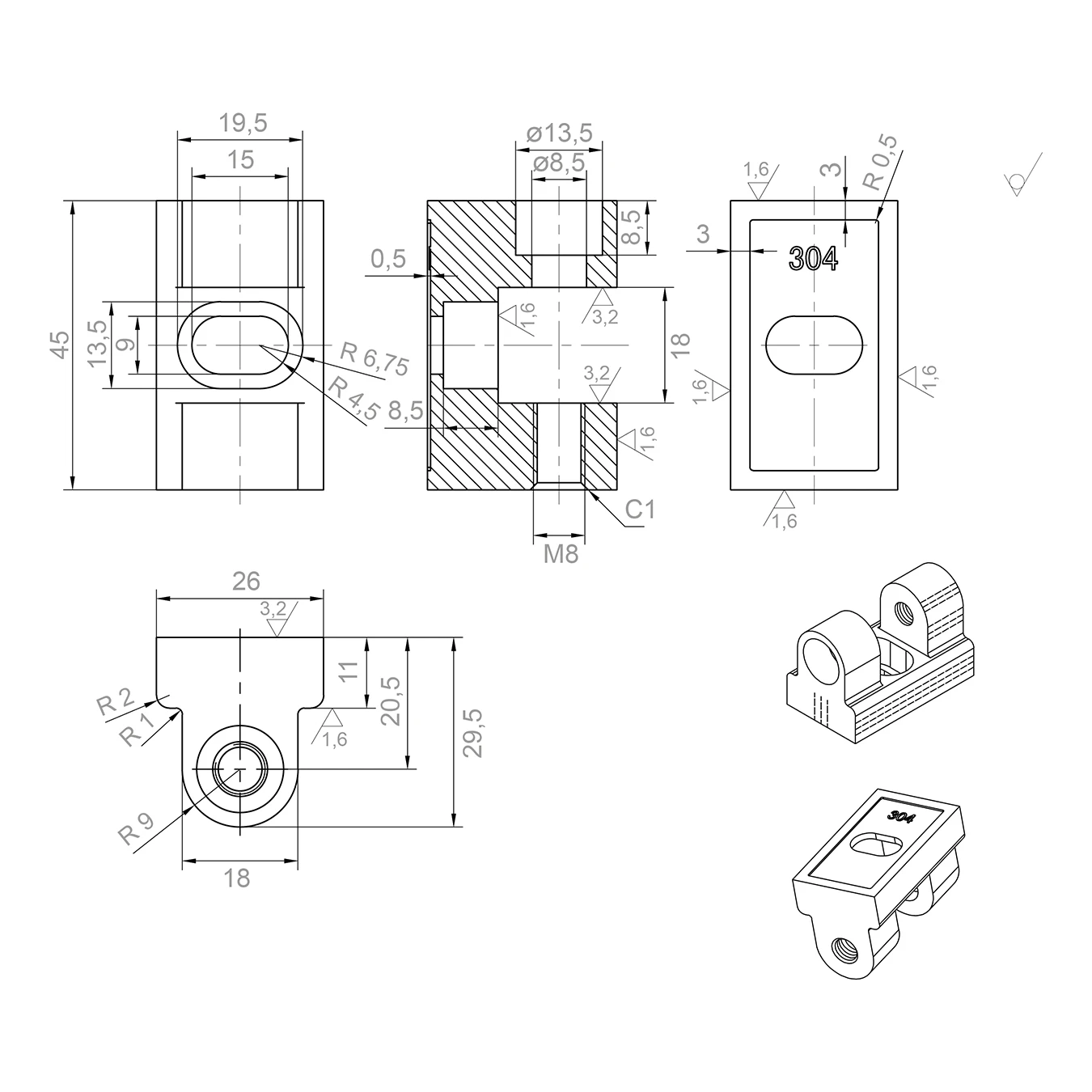 Het scharnierlichaam is vervaardigd van hoogwaardige roestvrijstaal AISI 304, wat langdurige corrosieweerstand garandeert — zelfs in omgevingen met verhoogde luchtvochtigheid, zoals badkamers, zwembaden of douchecabines. De satijn oppervlakteafwerking maskeert effectief vingerafdrukken en vervuiling, waardoor een esthetisch uiterlijk behouden blijft bij minimaal onderhoud. Op de technische tekeningen is de oppervlakteruwheid aangegeven Ra 1,6 en Ra 3,2 — wat de nauwkeurige mechanische bewerking van onderdelen bevestigt.