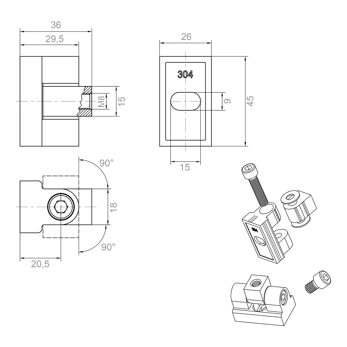 Het scharnier wordt gemonteerd op vlakke oppervlakken door inschroeven met gebruikmaking van schroefdraad M8. Deze methode zorgt voor hoge verbindingssterkte, eenvoudige installatie en eventuele demontage — zonder noodzaak van gespecialiseerd gereedschap. Het langwerpige gat in het lichaam maakt regeling van de glaspositie mogelijk binnen een bereik van 9 mm, wat nauwkeurige instelling van het glaspaneel tijdens montage vergemakkelijkt.