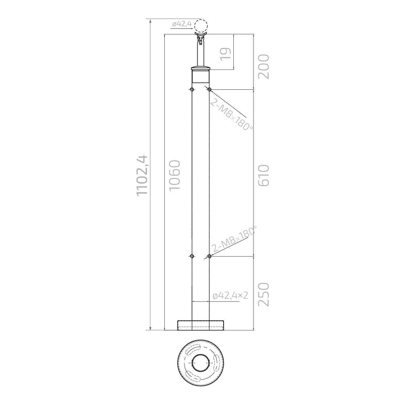Universele constructie maakt toepassing mogelijk in balkon- en trapbalustraden. De leuningdrager is niet permanent vastgelijmd — voor montage wordt anaerobe lijm voor roestvrijstaal gebruikt. Deze oplossing vergemakkelijkt de installatie, maakt vrije aanpassing van de paalstand aan bouwomstandigheden mogelijk en stelt in geval van noodzaak het inkorten van de paal toe zonder de fabrieksmontage te beschadigen. Totale hoogte inclusief leuning bedraagt 1102,4 mm, wat voldoet aan veiligheidsnormen voor balustraden.