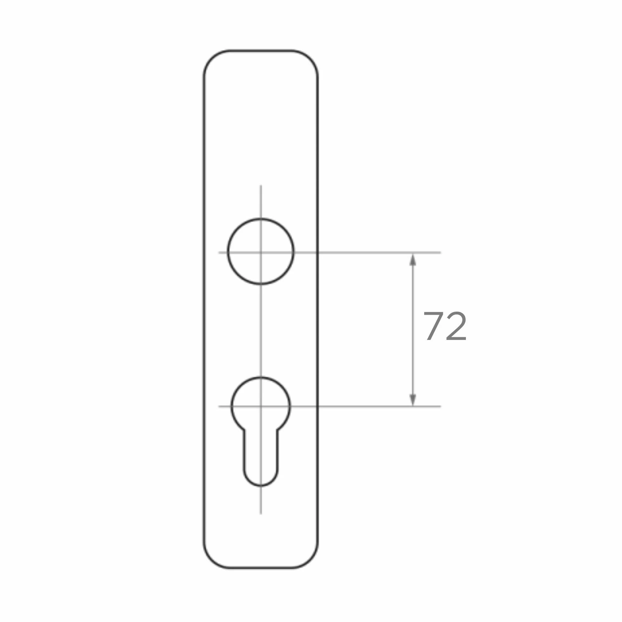De hartafstand tussen het gat voor de krukspil en de as van de slotvulinzet bedraagt 72 mm, wat overeenkomt met de meest gebruikte Europese standaard. Hierdoor is de complete set compatibel met populaire insteeksloten, wat de keuze van beslag vergemakkelijkt en de montagetijd verkort.