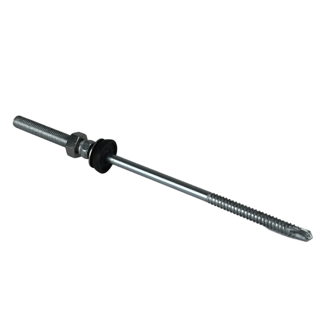 Bout met dubbele schroefdraad is een van de vele elementen die nodig zijn voor de installatie van fotovoltaïsche systemen. Het product is ontworpen voor montage op dakpanelen, platen, dakspanen of teerpapier. Kenmerkend voor het element zijn de twee verschillende schroefdraden aan de twee uiteinden. Het uiteinde met de metalen schroefdraad wordt rechtstreeks in de metalen dakconstructie geschroefd, terwijl de andere kant dient als bevestigingspunt voor adapters met flensmoeren.