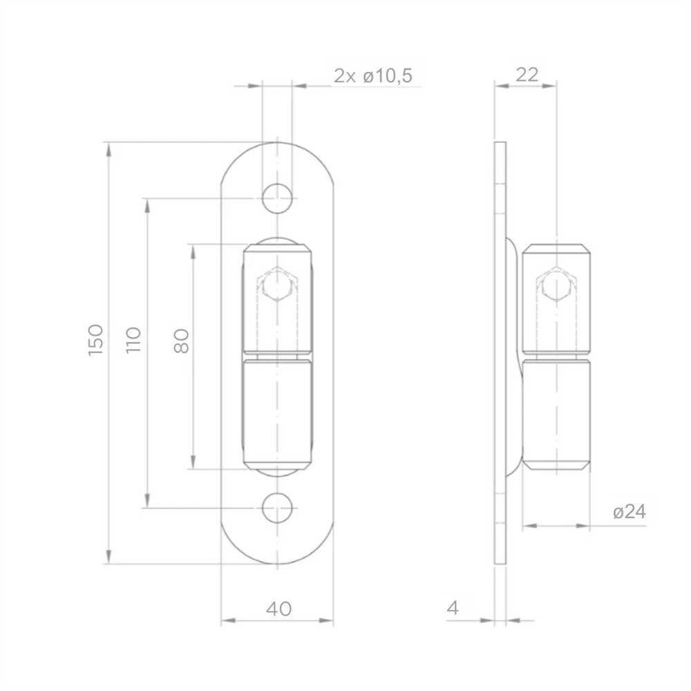 Het scharnier is bestemd voor schroefbevestiging — twee montagegaten met diameter 10,5 mm maken bevestiging mogelijk met M10 schroeven. Het bewijst zijn waarde als ophangingselement voor toegangspoorten, tuinhekken en andere zware hekwerkconstructies. De solide stalen constructie en gewalste kogel zorgen voor langdurige, storingsvrije werking zelfs onder moeilijke weersomstandigheden.