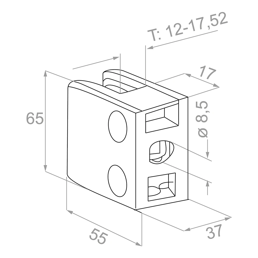 Rechthoekige glashouder 65 × 55 × 37 mm met beveiligingspin en beugel — een solide oplossing voor het bevestigen van glasplaten met een dikte van 12 tot 17,52 mm. Vervaardigd uit roestvrij staal AISI 304 met satijnafwerking, combineert het een hoge corrosiebestendigheid met een elegante, ingetogen uitstraling. De compacte constructie zorgt voor een stabiele klemming van het glas, terwijl de meegeleverde beveiligingspin het risico op onbedoeld uitschuiven van de glasplaat effectief minimaliseert.