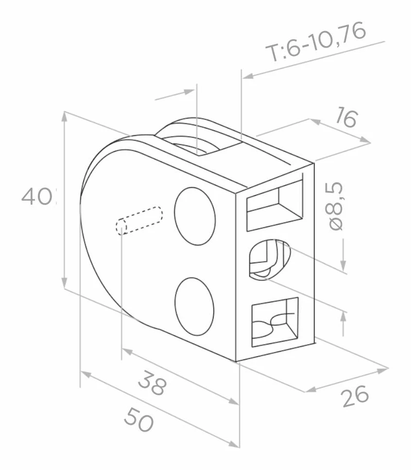 Het geaccepteerde bereik van glasdiktes omvat zowel enkelvoudige gehard glazen platen (bijv. 6 mm, 8 mm, 10 mm) als gelaagd glas (bijv. 8,76 mm, 10,76 mm), waardoor deze houder een universeel element is voor de meeste standaard configuraties van glazen balustrades.