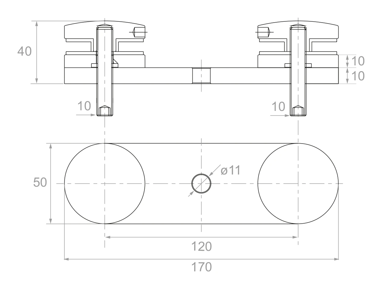 Dubbele punthouder voor glas met een diameter van fi 50 mm en een lengte van 170 mm, bestemd voor de montage van glasplaten met een dikte van 8 tot 21,52 mm in roestvrijstalen balustrades. Zorgt voor constructieve stijfheid en effectieve stabilisatie van glazen vullingen, met behoud van een moderne, minimalistische uitstraling.