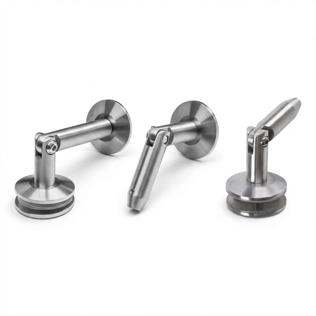 Het systeem bestaat uit drie nauwkeurig vervaardigde verbindingsstukken van roestvrij staal AISI 304 met een satijnafwerking, die jarenlange duurzaamheid en een esthetisch uiterlijk garanderen. Elk element heeft een verborgen bevestigingsgat, wat de gehele constructie een elegante, minimalistische uitstraling geeft. Het glas komt niet direct in contact met het metaal — de set bevat drukrubbers die de glasplaat beschermen en tegelijkertijd in de juiste positie stabiliseren.