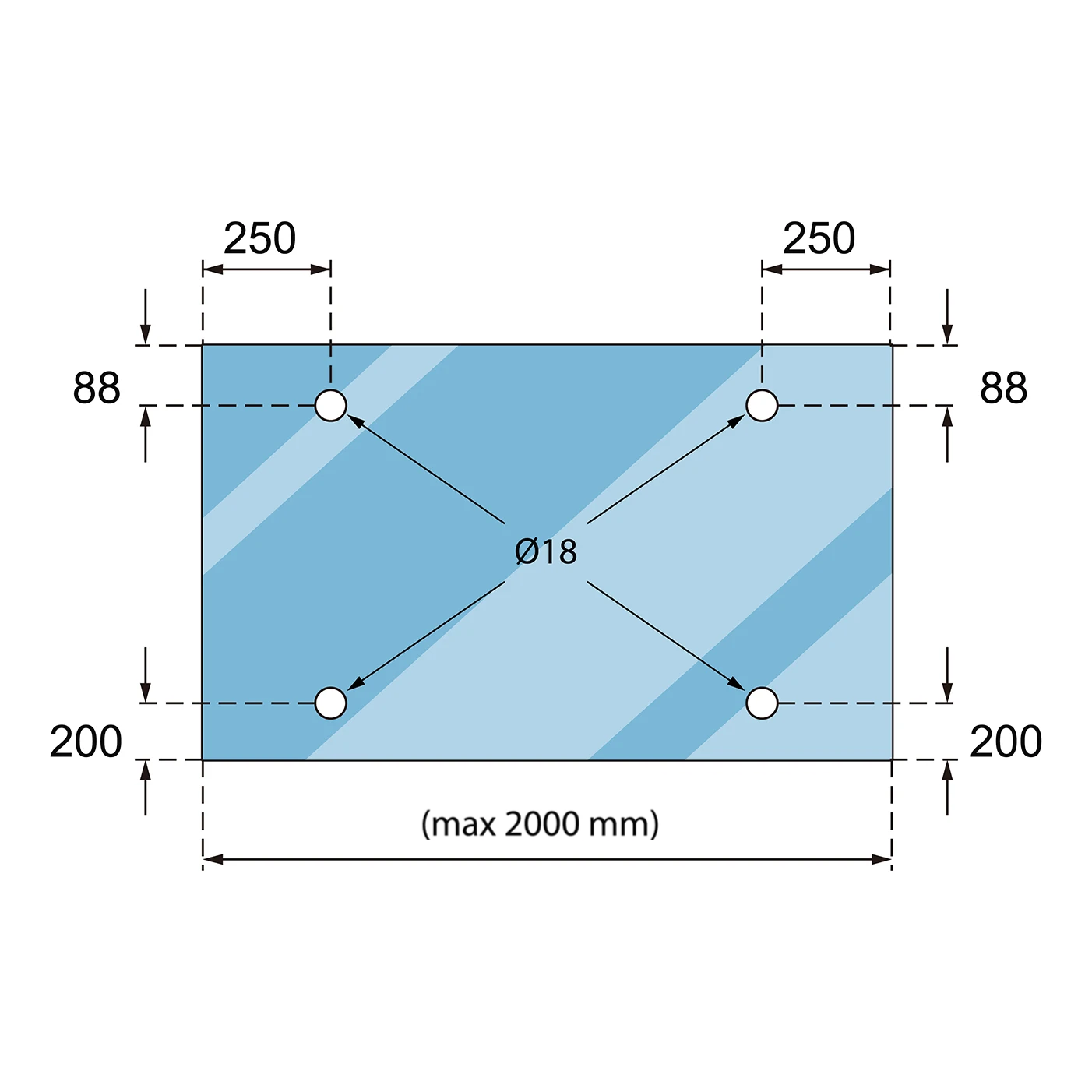 - Bovenste boringen (verbindingsstukken wand–glas): 88 mm vanaf de bovenrand, 250 mm vanaf de zijranden