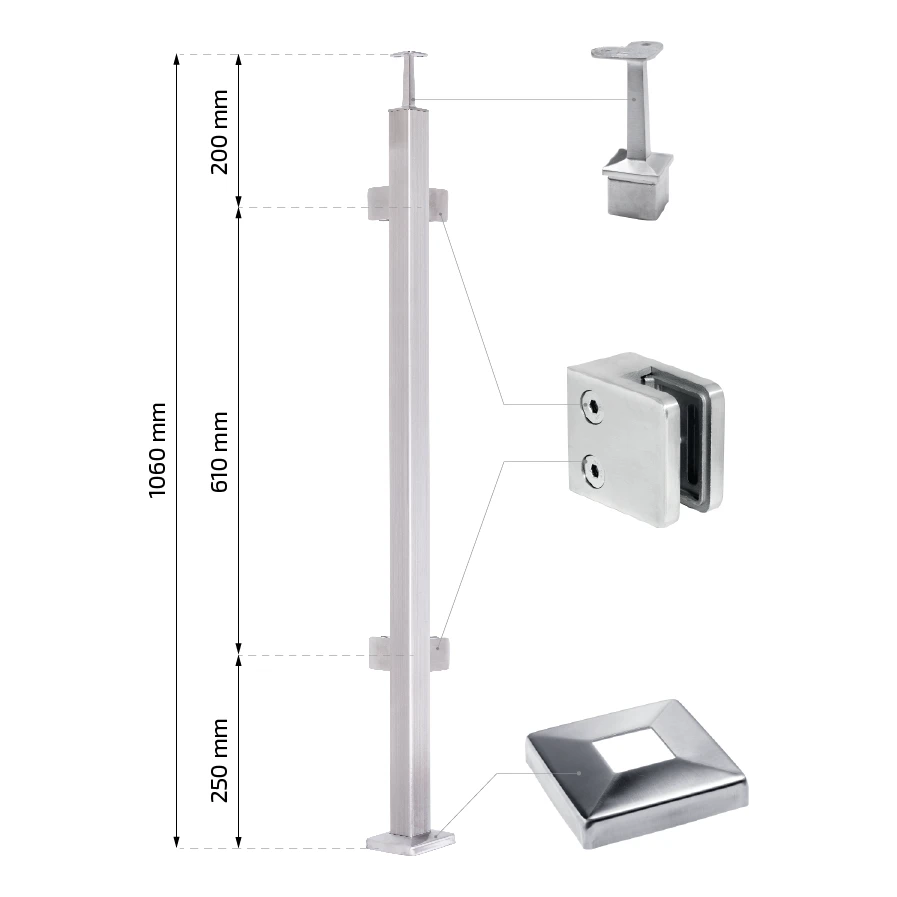 Hoekbalustradepaal RVS 40×40×1060 mm – 4 glashouders