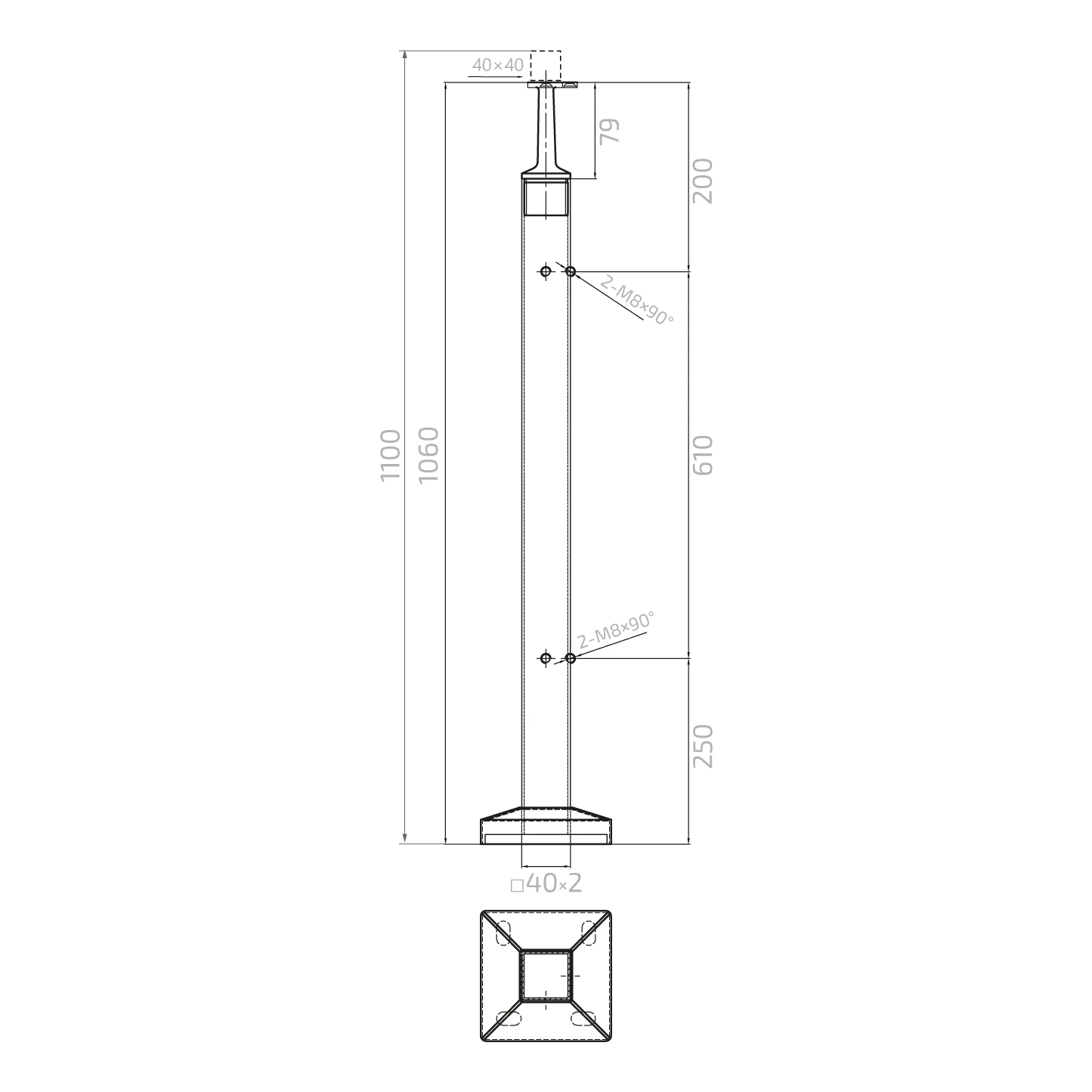 De paal is gemaakt van een gesloten profiel met doorsnede 40×40 mm en wanddikte 2 mm, wat hoge stijfheid en duurzaamheid van de hele constructie garandeert. Door het gebruik van roestvrijstaal AISI 304 toont het product zeer goede corrosiebestendigheid en weerbestendigheid, waardoor montage zowel binnen gebouwen als buiten mogelijk is — op balkons, terrassen of trappenhuizen.