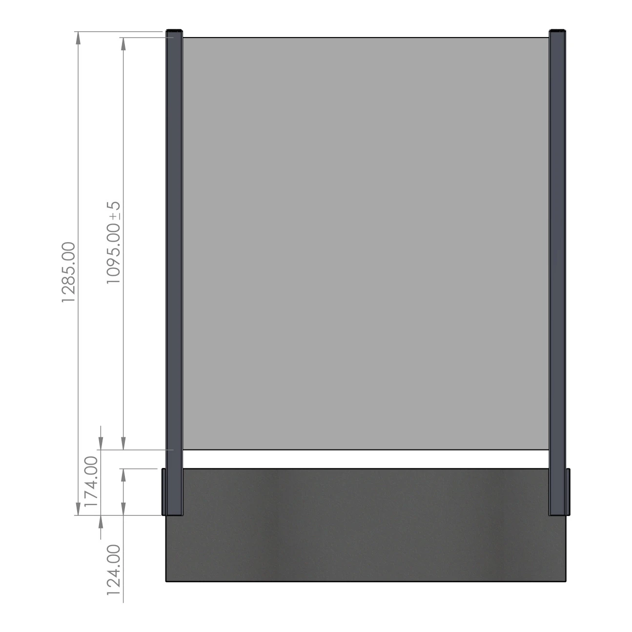 Na montage van de paal met glaspaneel bedraagt de totale hoogte van de balustrade 1285 mm. De ruit met maximale hoogte 1095 mm ±5 mm wordt geplaatst in de geleider van het profiel, en de afstand van de onderrand van de paal tot de onderrand van het glas bedraagt 174 mm. De hoogte van de onderste afdekking (montageelement) is 124 mm. De zijdelingse bevestigingswijze maakt het mogelijk om het volledige bruikbare oppervlak van het balkon of terras te behouden — niets steekt uit op de plaat.