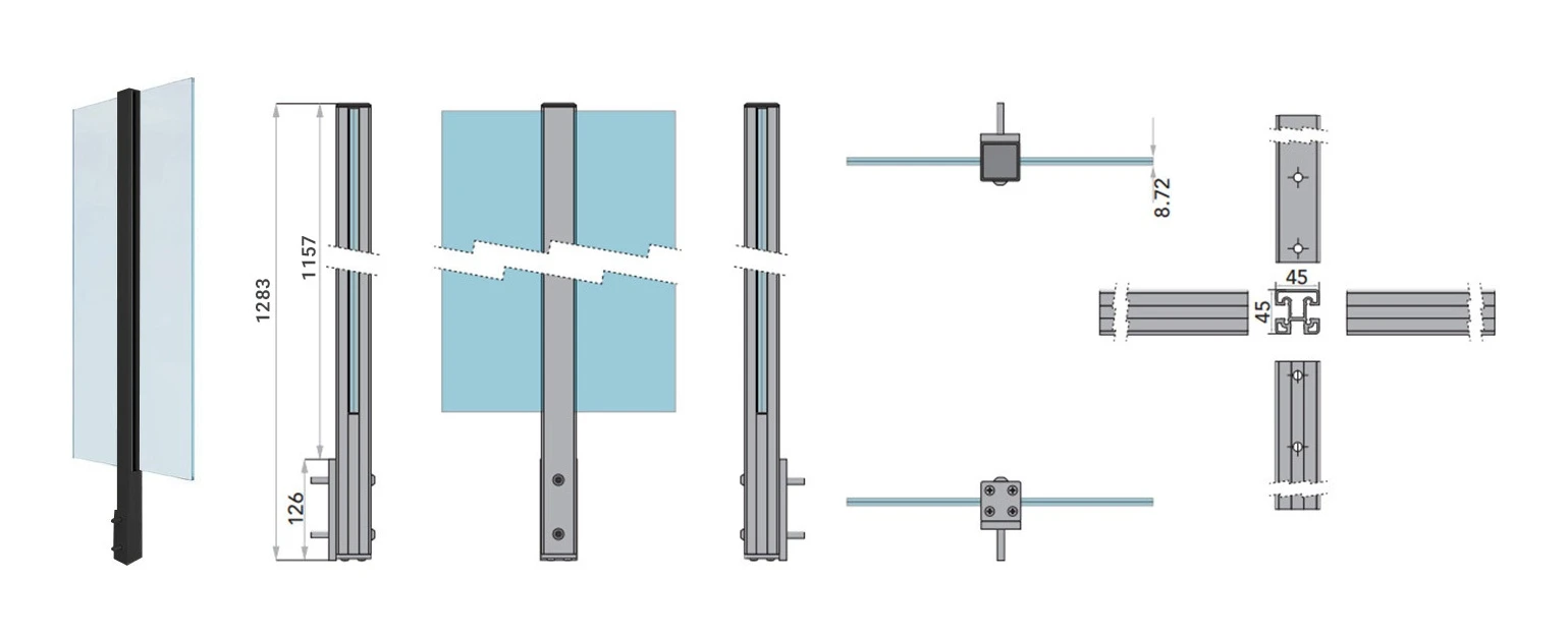 De montage-instructie omvat 8 eenvoudige stappen — van het bevestigen van het montageprofiel aan de muur, via het plaatsen van de paal op het basiselement, tot het inschuiven van de glaspanelen en beveiligen met de afsluiting. Dankzij het systeem van zijdelingse bevestiging op 4 gaten verloopt de hele installatie snel en vereist geen gespecialiseerde gereedschappen.