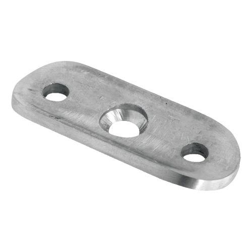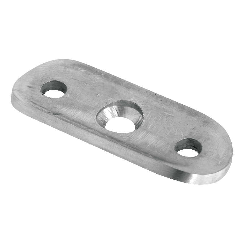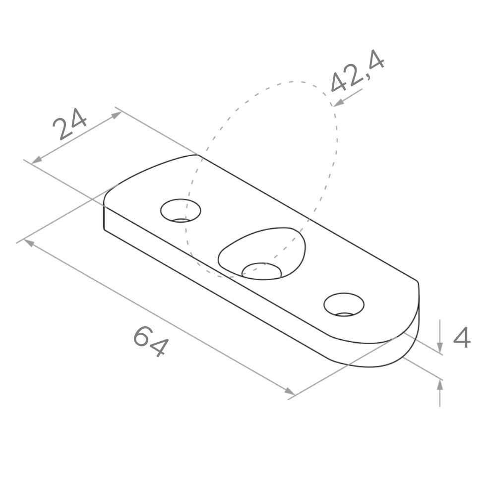 De onderzijde van de plaat is geprofileerd voor buisdiameter 42,4 mm, waardoor het element precies aansluit op het leuningoppervlak. Drie montagegaten (waaronder een centrale met conische verdieping) zorgen voor veilige en duurzame bevestiging. Compacte afmetingen en laag gewicht zorgen ervoor dat de plaat de balustradeconstructie visueel niet belast en het minimalistische karakter van de installatie behoudt.