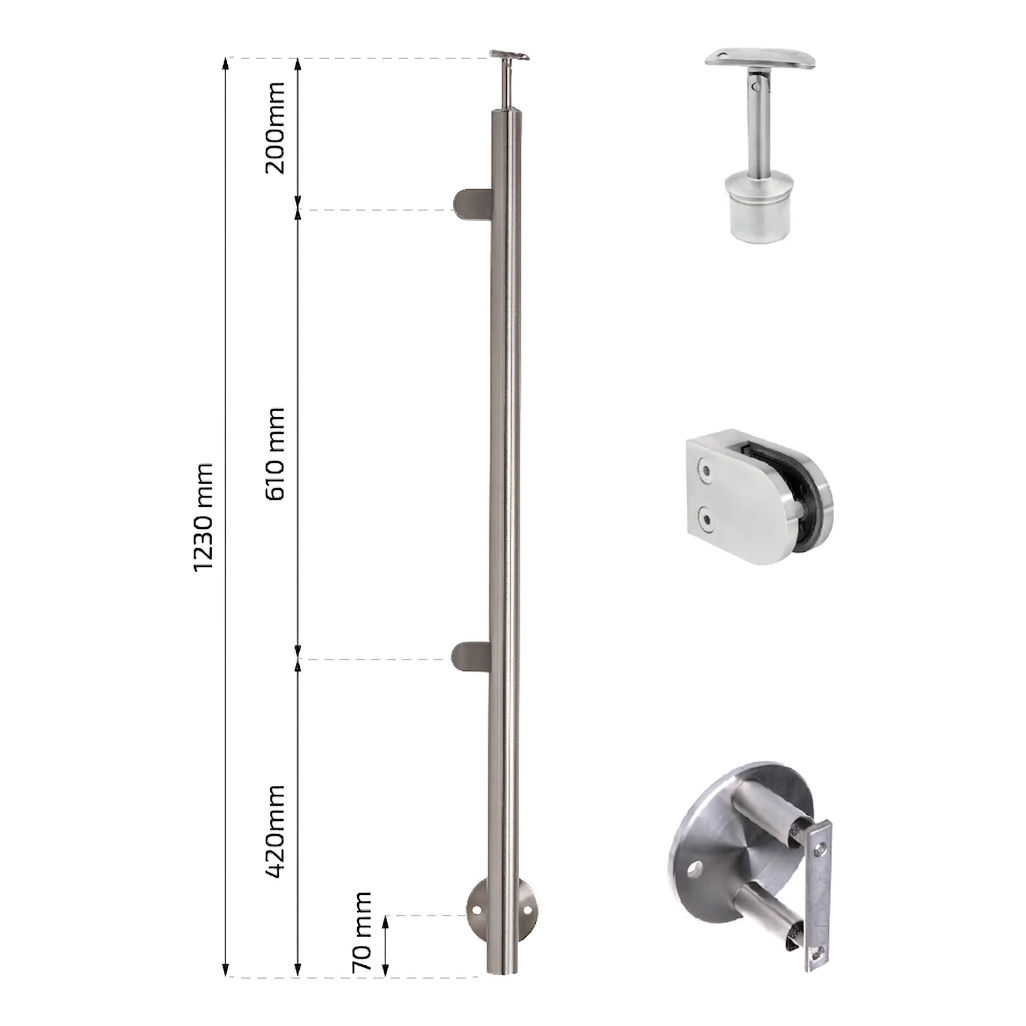 RVS linker eindpaal met diameter ø42,4 mm en hoogte 1230 mm, bestemd voor de bouw van elegante glazen balustrades. Uitgevoerd in hoogwaardige roestvrijstaal AISI 304 met satijnen afwerking, zorgt voor duurzaamheid en esthetisch uiterlijk zowel binnen als buiten gebouwen. De paal is uitgerust met twee glashouders en zijbevestiging aan de wand, wat zorgt voor snelle en stabiele montage zonder de noodzaak van verankering in de vloer.