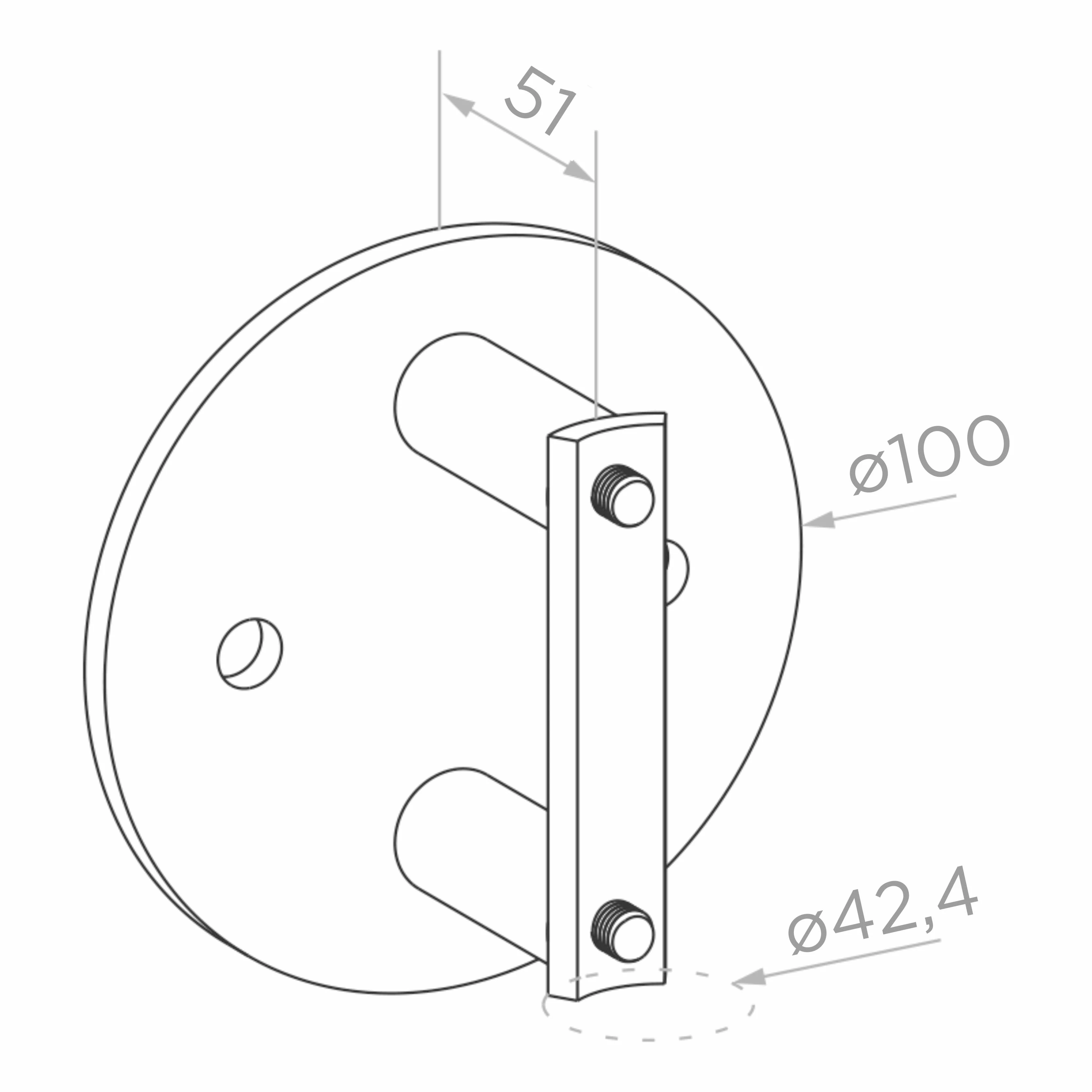 Montagerozet met diameter ø100 mm zorgt voor stabiele en esthetische bevestiging van de paal aan de wand. De montageafstand van 51 mm (van wandoppervlak tot paals) garandeert voldoende ruimte voor vrije geleiding van glaspanelen. De montagegaten in de rozet maken betrouwbare verankering mogelijk aan gemetselde, betonnen en andere dragende constructies.