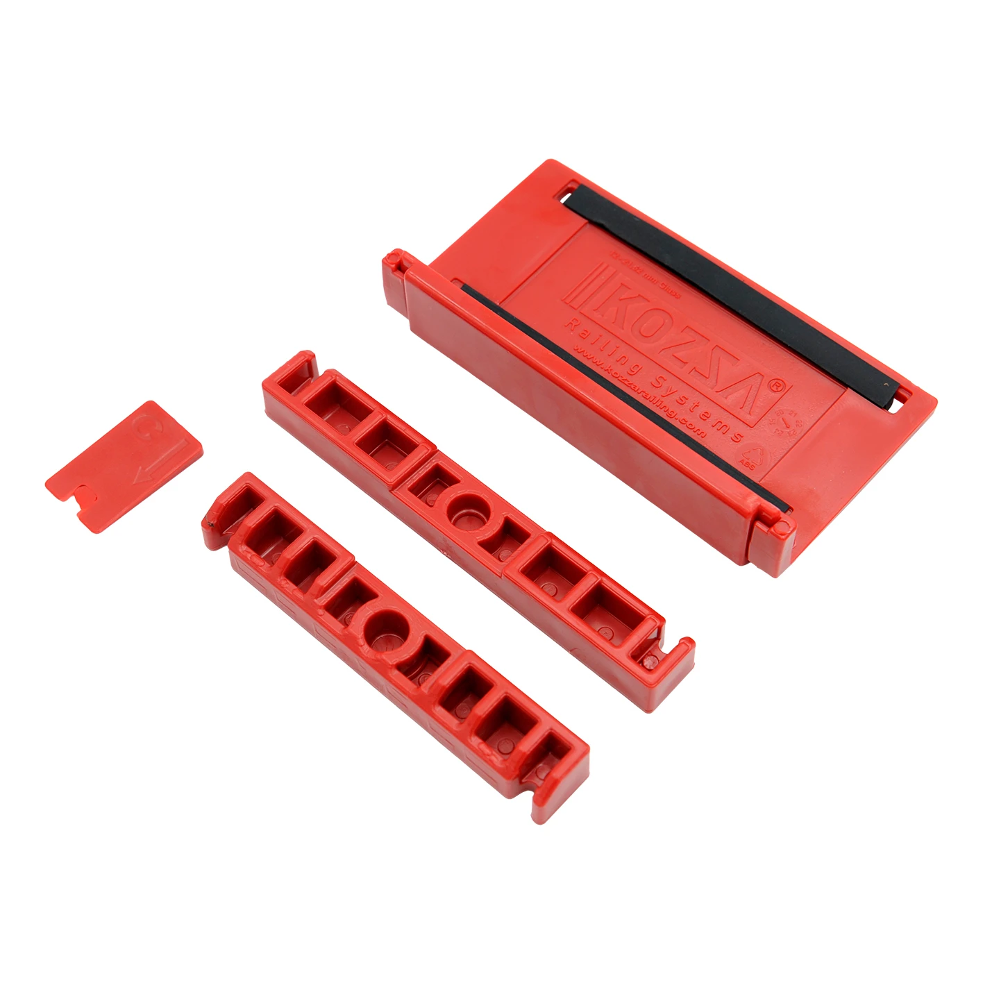 De set bevat speciale kunststof montage-elementen die zorgen voor een betrouwbare en herhaalbare positionering van het glas over de volledige lengte van het profiel. Elke set bestaat uit een hoofdstabilisatie-element, twee zijgeleiders en een borgclip — in totaal 20 sets per verpakking, voldoende voor een profiel van 5 meter lang.