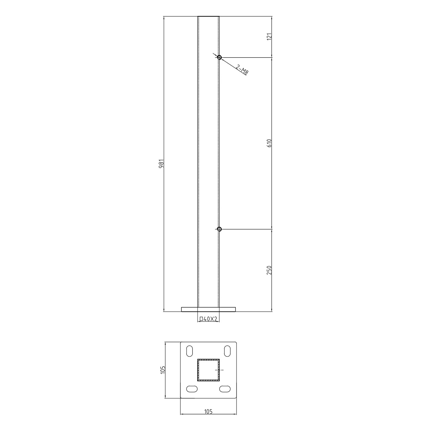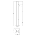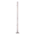 De paal wordt direct aan de vloer gemonteerd met behulp van de aangelaste voetplaat van 105×105 mm met vier ovale gaten. De ovale vorm van de gaten (20×11 mm) maakt correctie van de positionering tijdens montage mogelijk. Twee draadgaten M8 op de paal met hart-op-hart afstand van 610 mm maken snelle bevestiging van balustrade dwarsbalken mogelijk zonder boren of tappen op de bouwplaats.