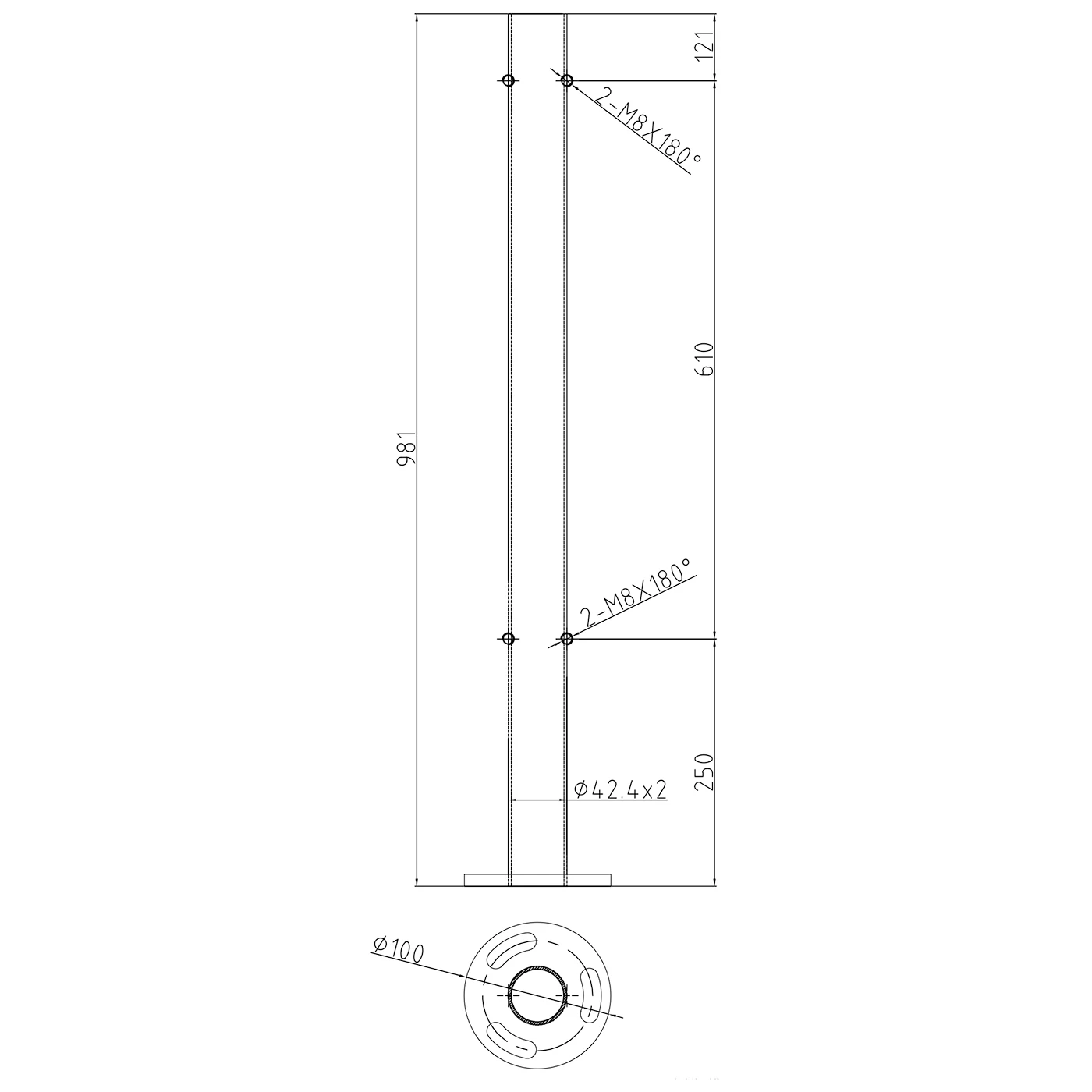 De aangelaste montagekraag met diameter 100 mm met drie boonvormige gaten zorgt voor stabele bevestiging aan de vloer en eenvoudige positieregeling. Het geheel vormt een kant-en-klaar, ongewapend element van het balustradesysteem 42,4 mm van het merk PINOX, compatibel met een breed assortiment doorlopende houders en leuningen.