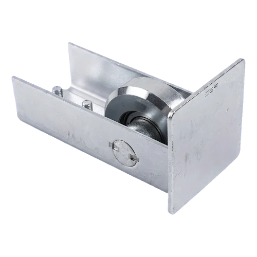 Oprijrol met afsluiting is een stalen, gegalvaniseerd element dat aan het begin van de rail van een zelfdragende schuifpoort wordt gemonteerd. De functie is samenwerking met de oprijbeugel die aan de paal wordt bevestigd — na sluiting van de poort rijdt de rol in de beugel, wat het gewicht van de poortvleugel over meer steunpunten verdeelt en de poort effectief stabiliseert in de eindpositie.