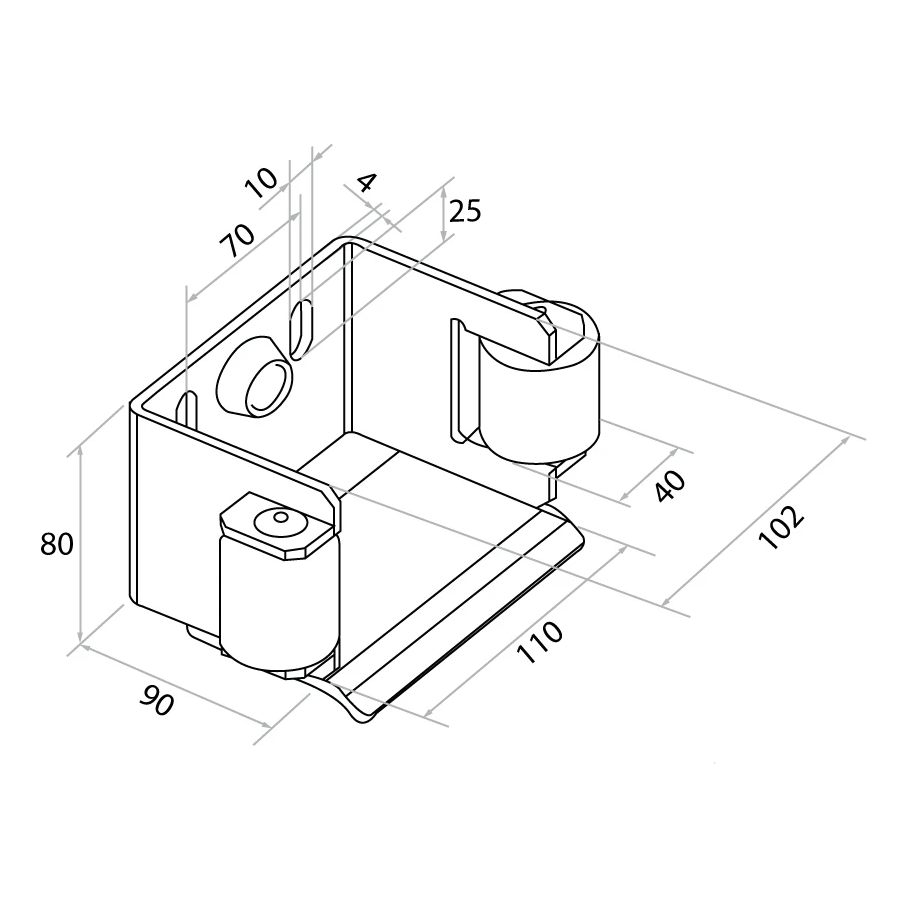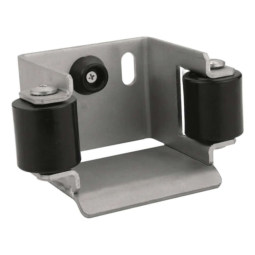 De steun is compatibel met geleidingsrails met dwarsdoorsnede 80×80 mm en 70×70 mm. Twee geleidingsrollen van kunststof zorgen voor stille en soepele werking van de poort, waarbij wrijving en slijtage van de rail worden geminimaliseerd. Op de achterwand van de steun bevinden zich twee montagegaten (langsgaten) die nauwkeurige regeling van de positie mogelijk maken, en een ingebouwde rubber buffer dempt de slag van de poortvleugel in gesloten positie.
