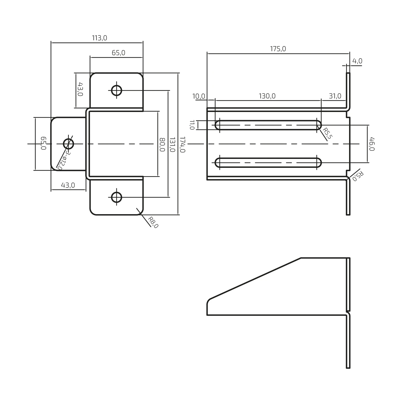 - Montagegaten: 3 × ⌀12 mm (op zijflenzen)