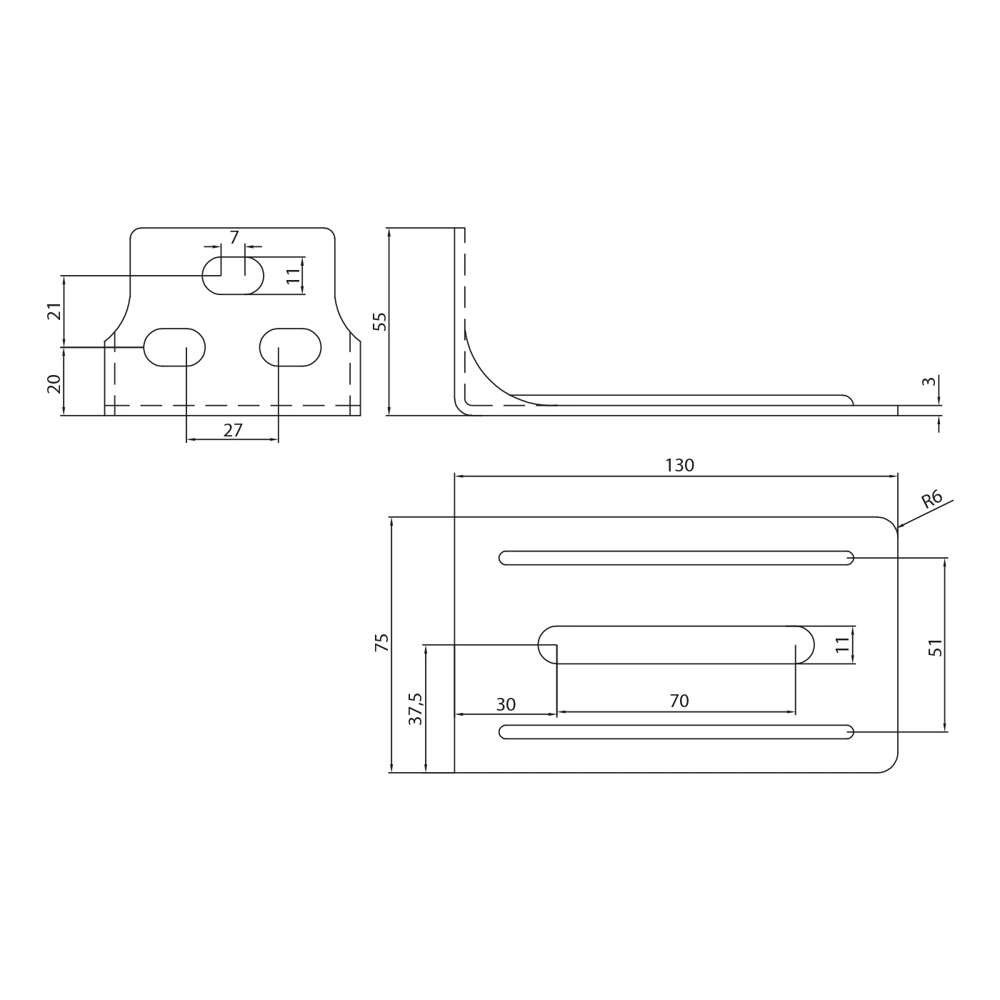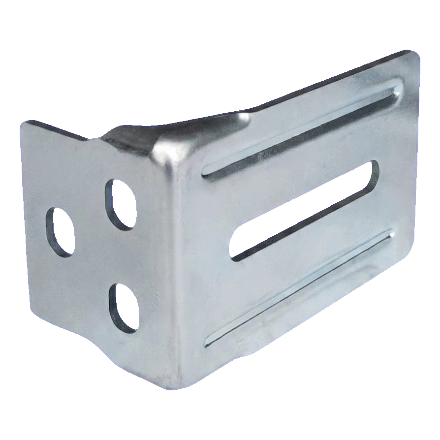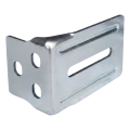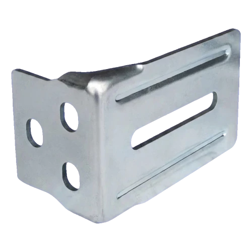 De beugel heeft een L-vorm en is voorzien van sleutelgaten (langwerpig) zowel op de verticale als horizontale flens, wat nauwkeurige positieregeling van de oprijhuls tijdens montage mogelijk maakt. Ronde gaten op de verticale wand dienen voor extra bevestiging. Deze constructie stelt installatiebedrijven in staat tot snelle montage met mogelijkheid tot correctie van instelling zonder de noodzaak om nieuwe gaten te boren.