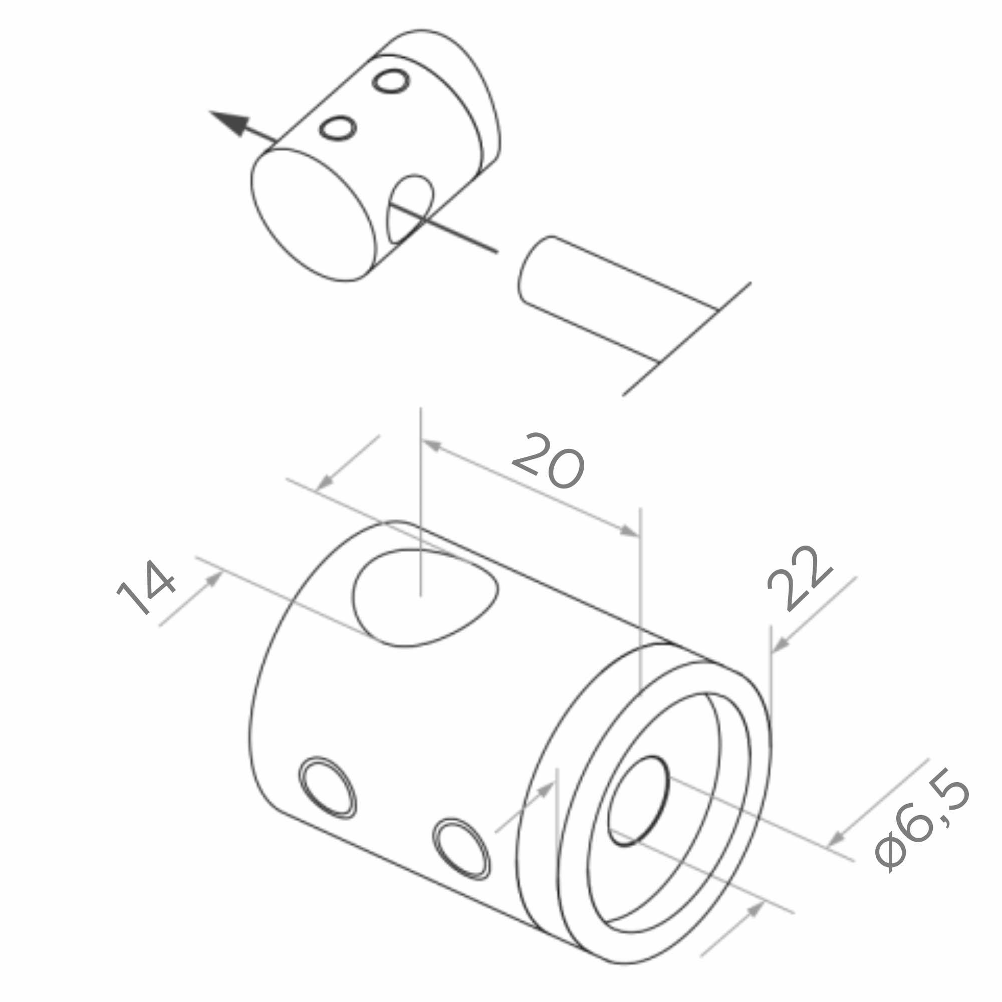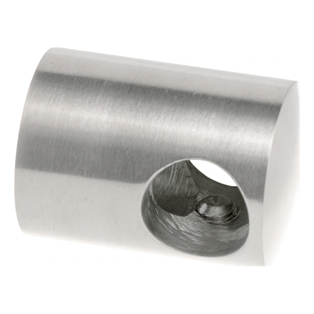 De klem heeft de vorm van een cilindrische behuizing met een doorvoergat waar de staaf of buis doorheen loopt. Bevestiging aan het vlak gebeurt van onderaf via het montagegat. Twee zijdelingse stelschroeven zorgen voor betrouwbare vergrendeling van de staaf binnen de klem. Dankzij de compacte afmetingen integreert het element discreet met het moderne design van roestvrijstalen balustraden.