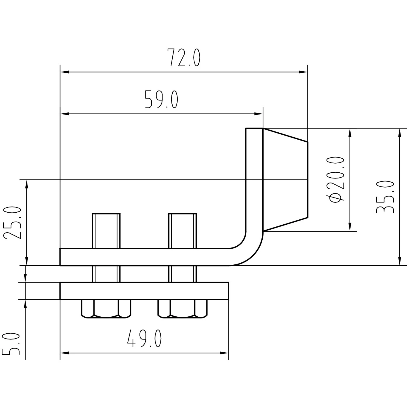 - Hoogte verticale arm: 25 mm
