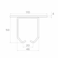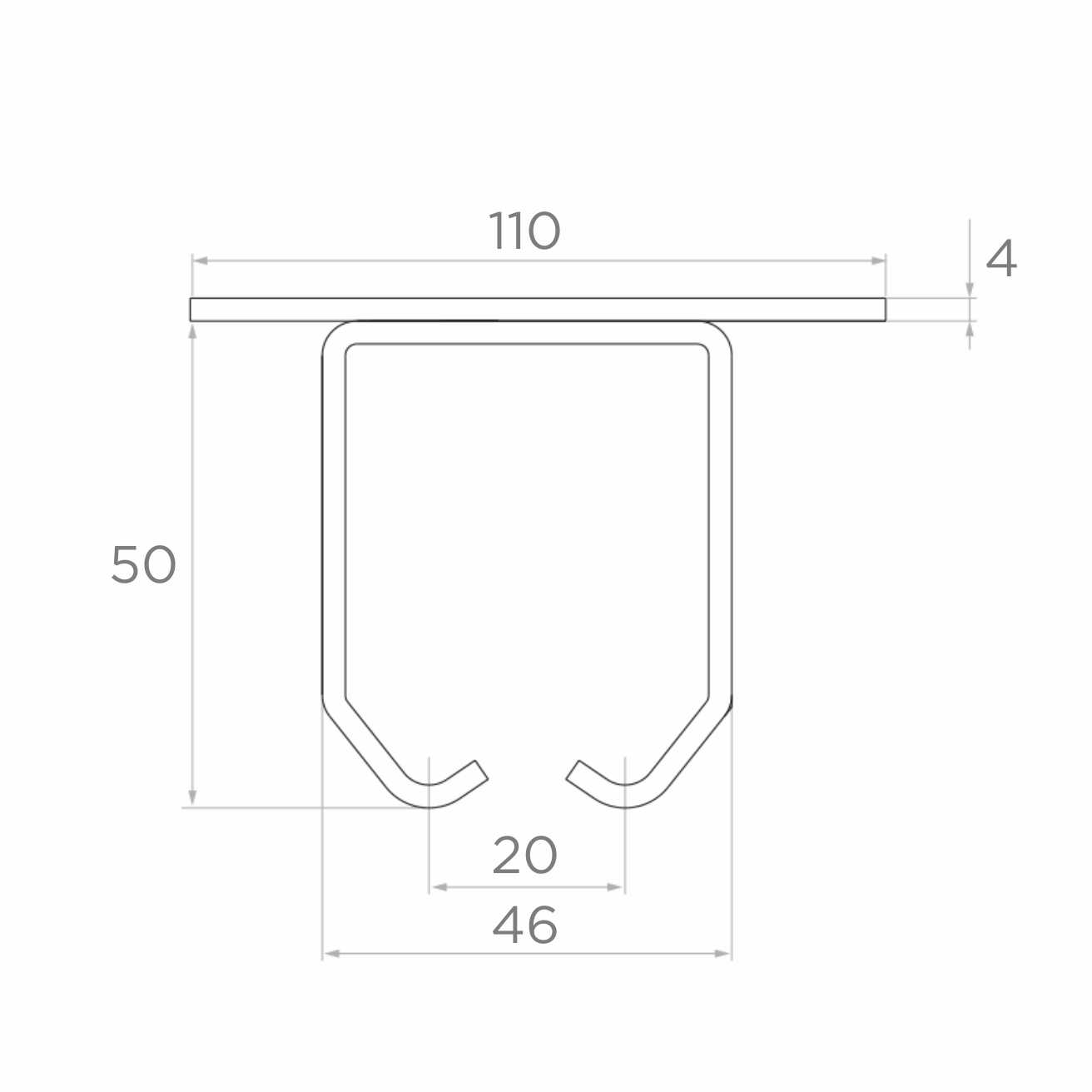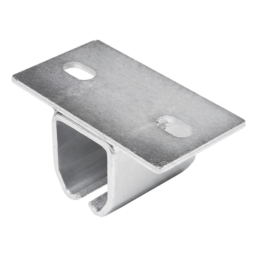 De hanger bestaat uit een brede montageplaat met gaten voor vastschroeven aan een latei of ondersteunende constructie en uit een geprofileerde beugel die de rail van bovenaf omvat. De vorm van het profiel zorgt voor stabiele plaatsing van het U-profiel en gelijkmatige overdracht van belastingen. Montagegaten (waaronder één ovaal) vergemakkelijken positieregeling tijdens installatie, wat de uitlijning van de rail over de gehele lengte van de poort versnelt.