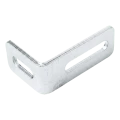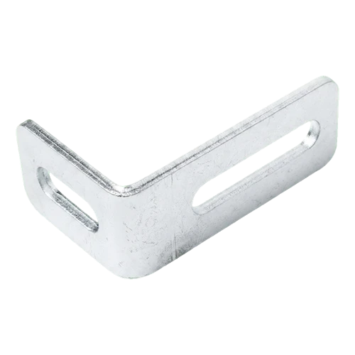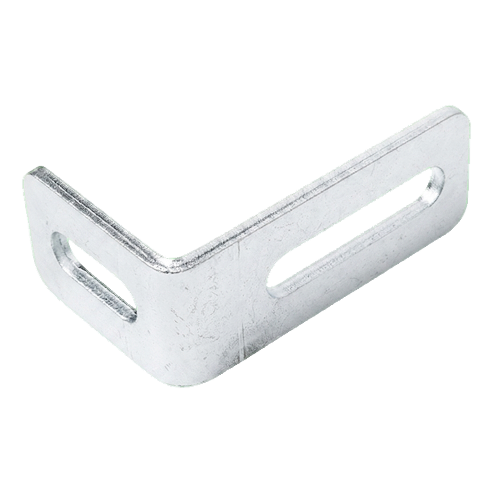 De hoekbeugel dient voor bevestiging van de geleidingsrol aan de paal van een zelfondersteund schuifhek. De ovale instelling gaten op beide armen maken vloeiende correctie van de positie van de rol ten opzichte van het rijprofiel van het hek mogelijk — zonder de noodzaak van opnieuw boren van gaten. Dit is een belangrijk voordeel bij montages waar precieze instelling van de hekvleugel geleiding vereist is.