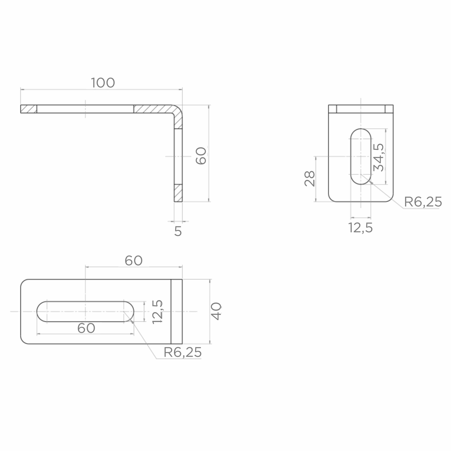 - Ovaal gat – horizontale arm: 60 × 12,5 mm (boogradius R 6,25 mm)