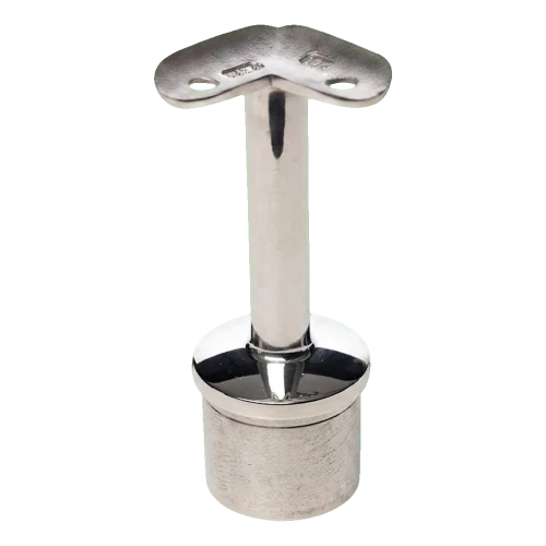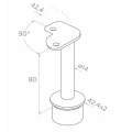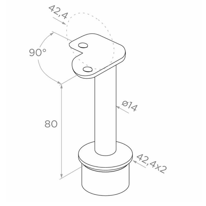 De drager is gemaakt van roestvrijstaal AISI 304 met gepolijste afwerking (glans), wat hoge corrosiebestendigheid en elegante uitstraling garandeert. De constructie bestaat uit een cilindrische basis aangepast aan de paalbuis 42,4×2 mm, een pin met diameter Ø14 mm en een montageplaat met twee gaten waarop de leuning met diameter 42,4 mm rust. De hoogte van paal tot leuning na montage bedraagt 80 mm.