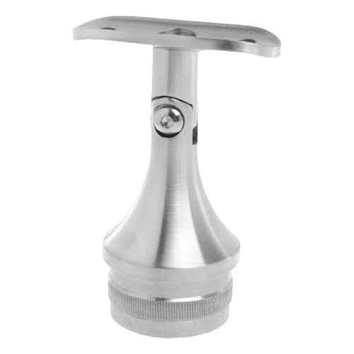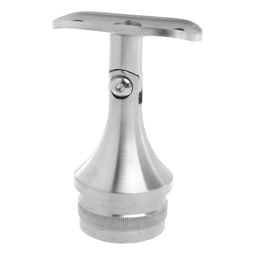De drager wordt gemonteerd door inslaan in opening van paal met binnendiameter overeenkomend met buis 42,4×2 mm. Het zadel bovenaan past zich aan de leuning met diameter 42,4 mm aan, en het gewricht maakt hoekregeling mogelijk — bijzonder handig bij trapovergangen waar de leuning onder helling moet lopen. Na instelling van de juiste hoek wordt de positie geblokkeerd door een inbusschroef zichtbaar op de pin. Het aantal dragers in de balustrade hangt af van de vorm, lengte en onderlinge afstand van de palen.