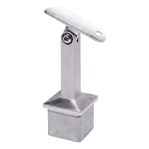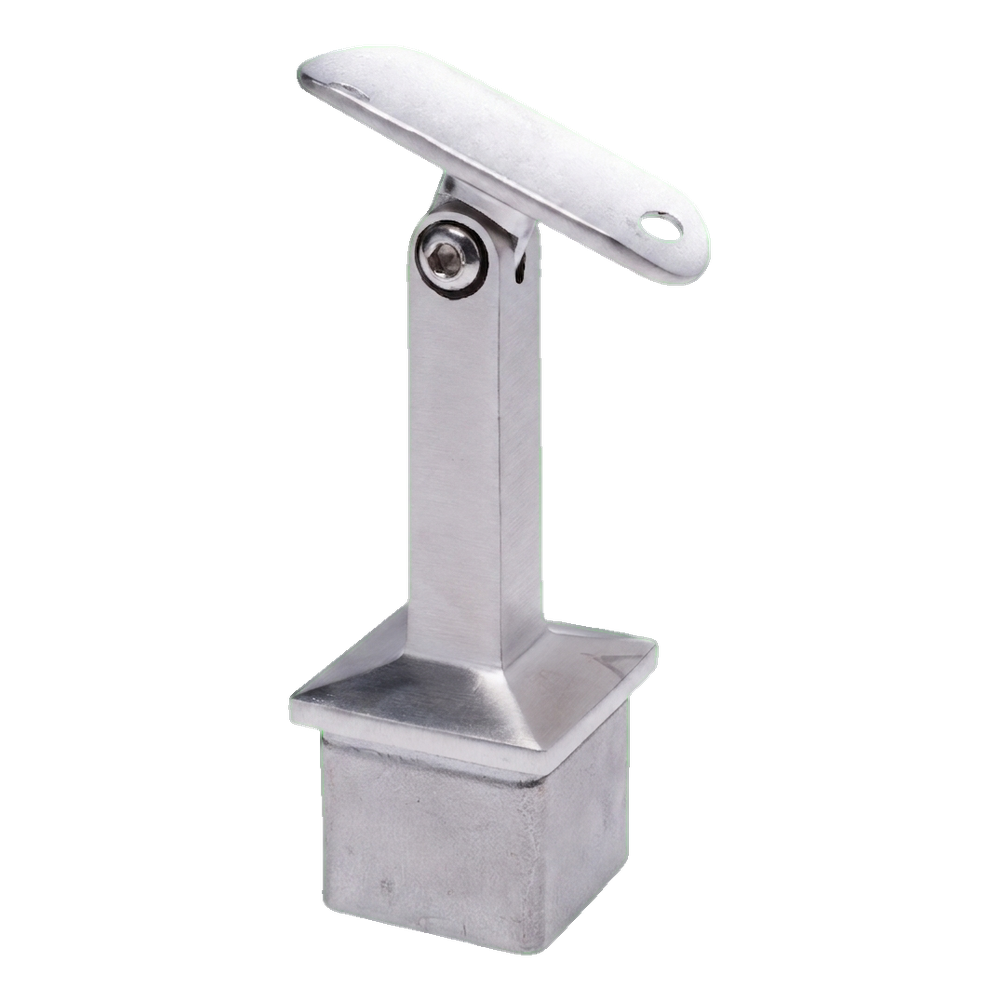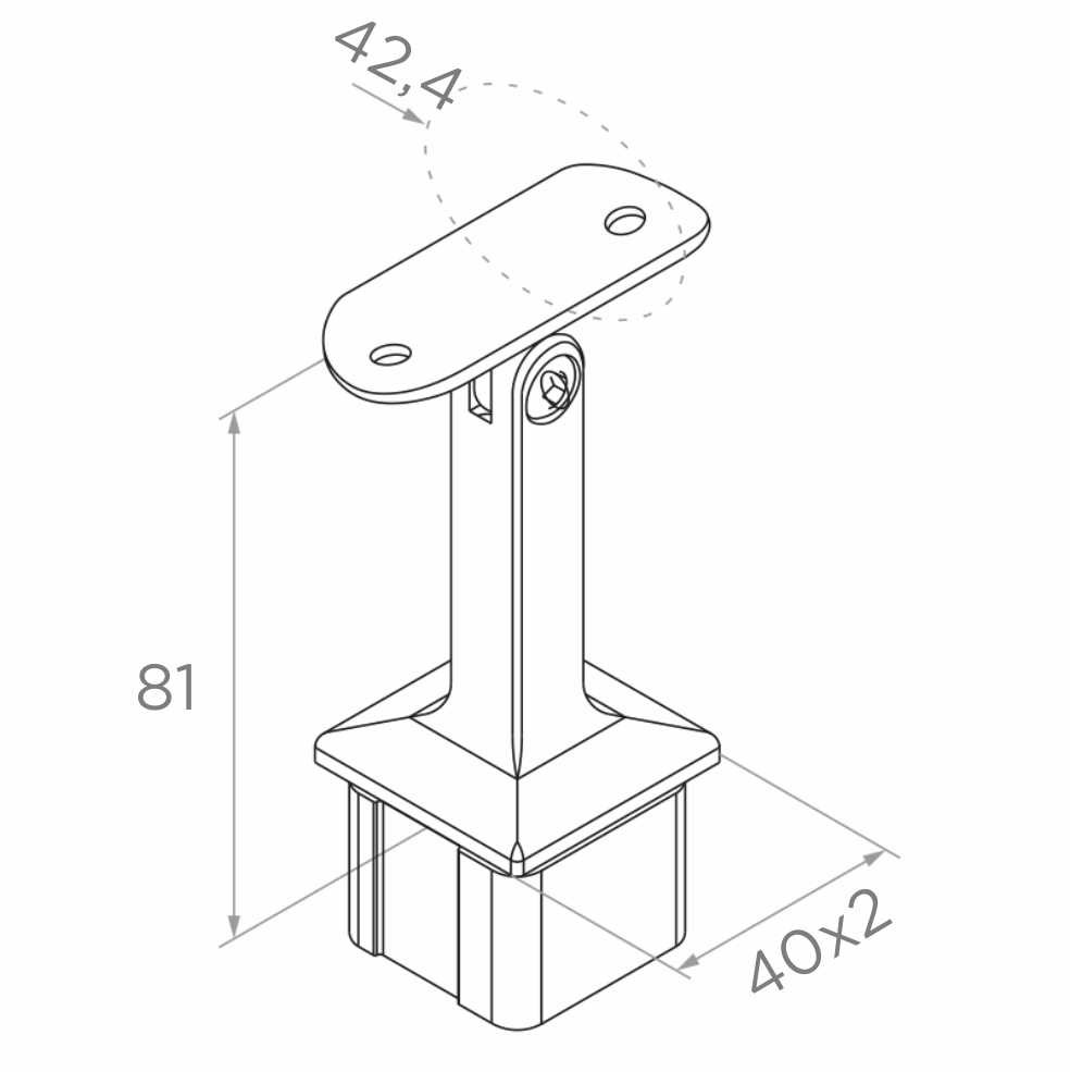 Flexibele leuningdrager bestemd voor het verbinden van vierkante paal 40×40 mm met leuning met diameter 42,4 mm in roestvrijstalen balustrade constructies. Dankzij het verstelbare scharnier maakt het element vrije instelling van de hellingshoek van de leuning mogelijk, wat bijzonder nuttig is bij montage van trapbalustrades — elimineert de noodzaak van bijsnijden en aanpassen onder hoek op de bouwplaats.