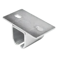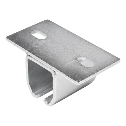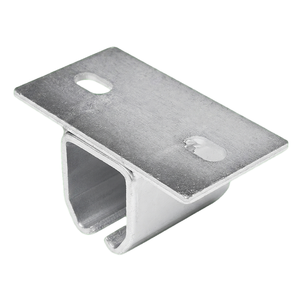 De ophangbeugel heeft een vlakke montageplaat met gaten voor bevestiging aan plafond of draagprofiel. Het onderste deel vormt een C-vormige houder die de rijrail omsluit en stabiele geleiding van de poort verzekert. Het profiel van de ophangbeugel is precies gebogen en de omgebogen randen van de onderste opening verhogen de stijfheid van de constructie en vergemakkelijken het inschuiven van de rail.