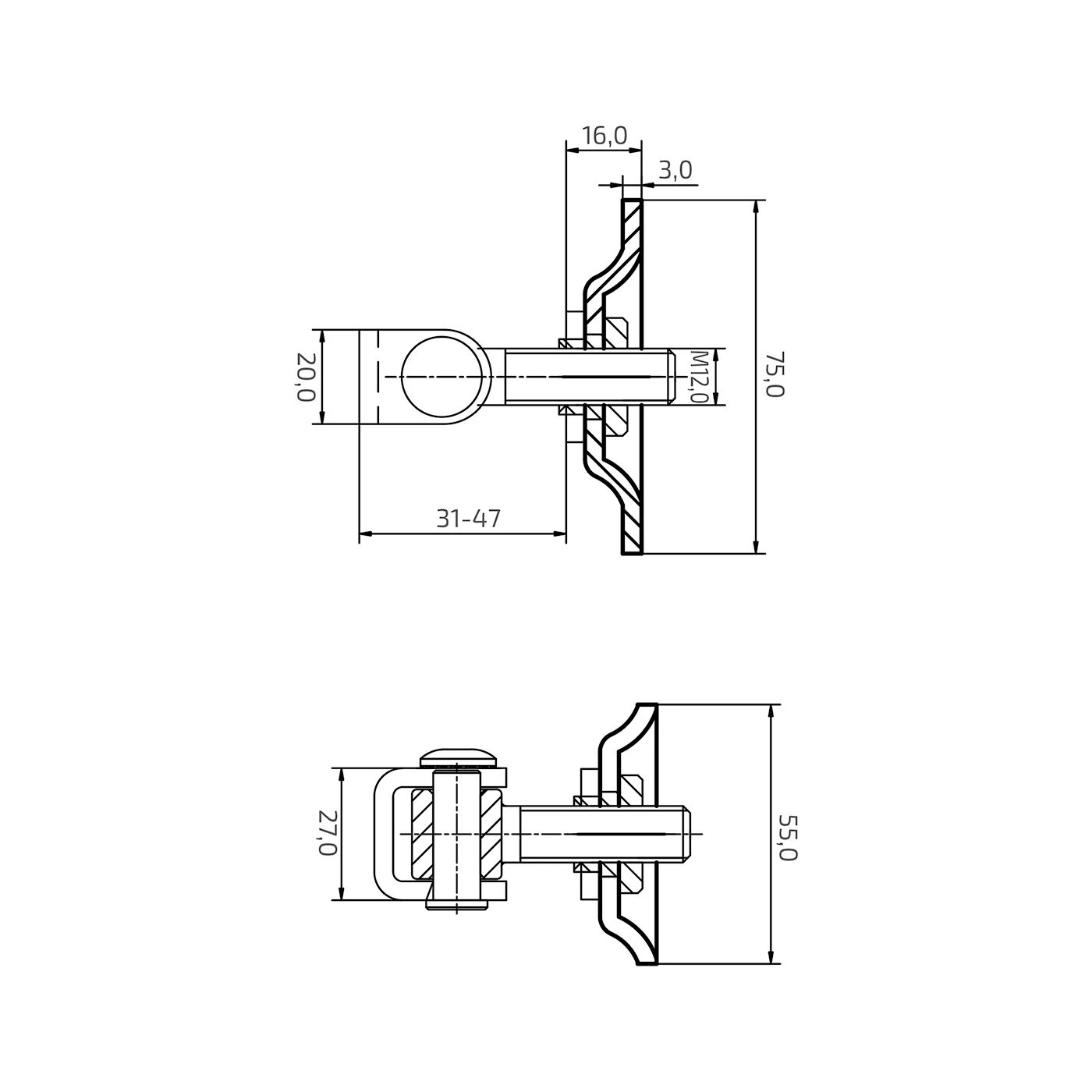 De stelmoer op de M12 schroefdraad maakt een nauwkeurige aanpassing van de penuitsteek mogelijk binnen het bereik van 31–47 mm. Hierdoor kan de positie van de poortvleugel worden gecorrigeerd wanneer deze doorhangt onder invloed van het gewicht of intensief gebruik. De regeling zorgt voor soepel openen en sluiten van de poort en voorkomt voortijdige slijtage van de ophangingselementen.