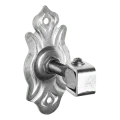 Het geheel is gegalvaniseerd, wat jarenlange corrosiebescherming biedt en het gebruik van het scharnier buitenshuis mogelijk maakt zonder extra oppervlaktebescherming. Het decoratieve schild met gestempeld ornament geeft het element een esthetische uitstraling, waardoor het perfect past bij smeedijzeren poorten en hekwerken.