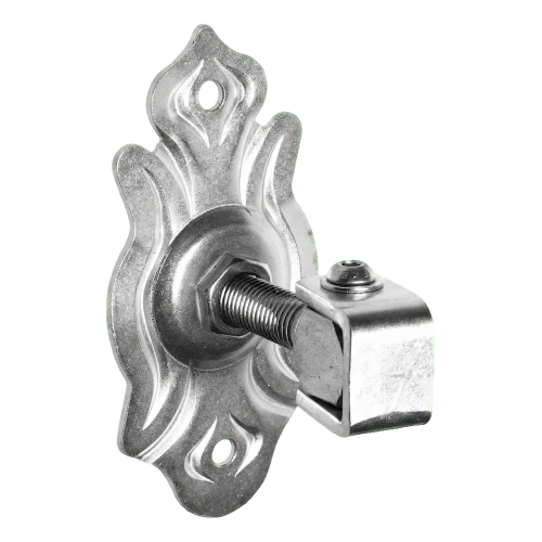 Stalen regelbaar scharnier met decoratief schild bestemd voor montage van poorten en hekken. Schroef M16 met stelmoer maakt precieze correctie van de vleugelstand mogelijk op elk moment — zowel direct na montage als tijdens gebruik, bijvoorbeeld wanneer door lage temperaturen of doorhangen van de constructie hernieuwde afstelling nodig is.