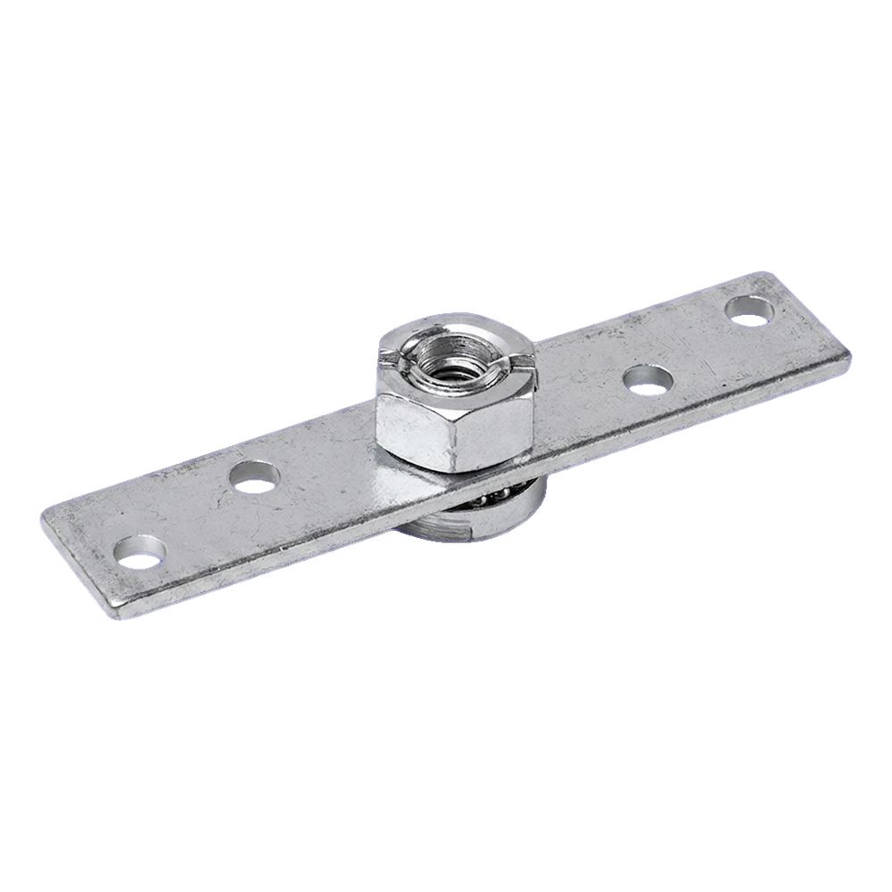 De montageplaat is bestemd voor schuifheksystemen als verbindingselement tussen het hekframe en de rijrollenassemblage. De draaibare bevestiging zorgt voor zelfuitlijning van de rollen ten opzichte van de rijrail, wat resulteert in stillere en gelijkmatigere werking van het hek. Dit is een essentieel element bij professionele montage van schuifheksystemen op grondsporen.