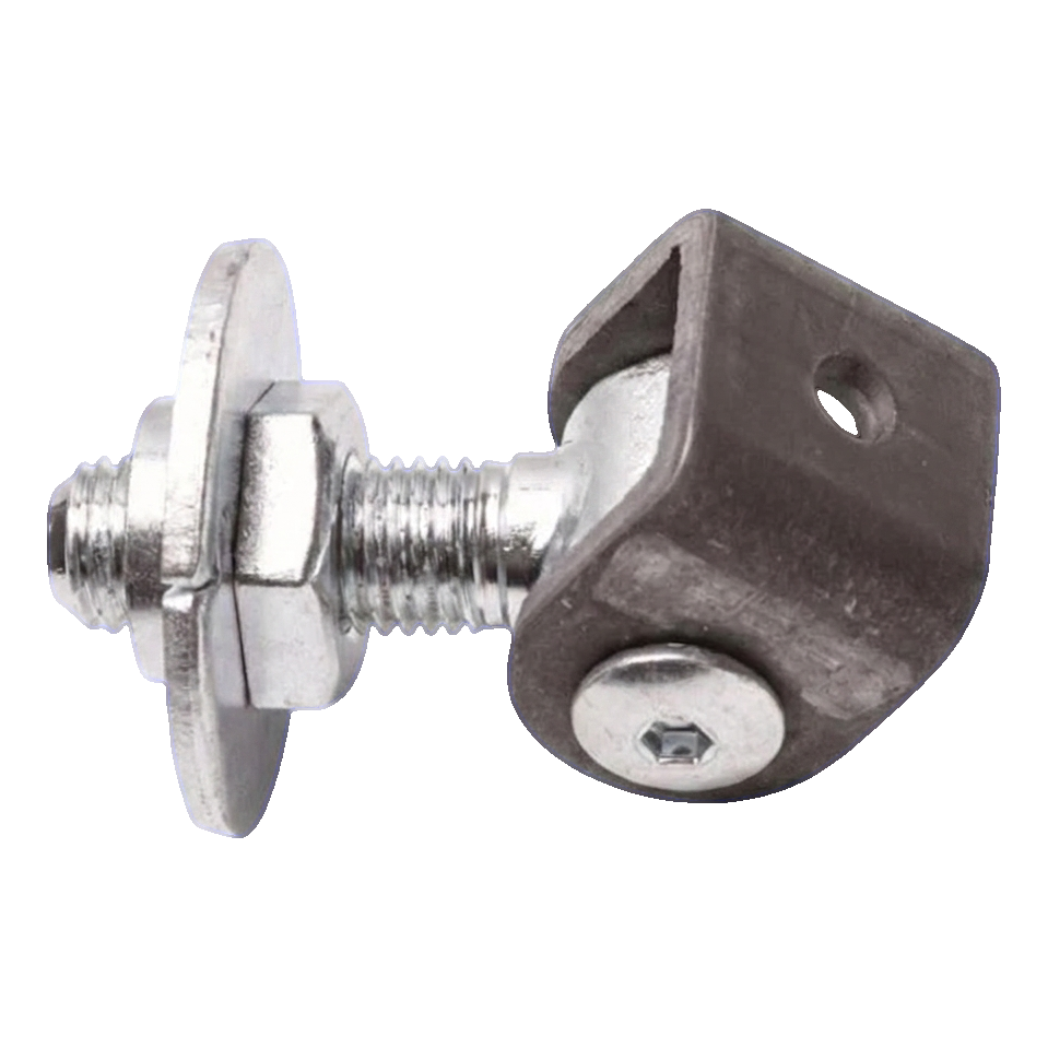 Het scharnier bestaat uit een zwart oor voor lassen in de poortvleugel en een verzinkte bout met steunring, die in de paal wordt gemonteerd. Dankzij de schroefdraadverstelling is compensatie van doorzakking van de vleugel of thermische vervormingen op elk moment mogelijk — zonder de noodzaak van lassen of vervanging van onderdelen.