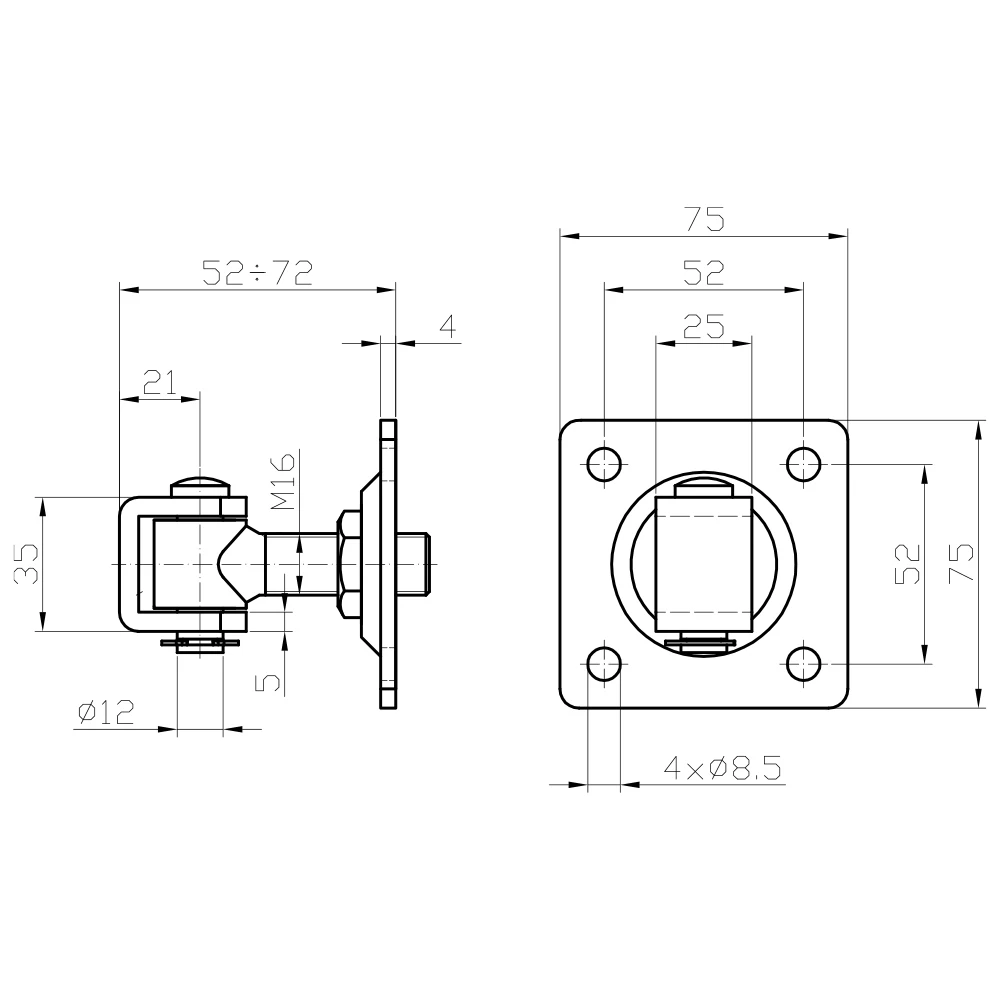 De montageplaat met afmetingen 75×75 mm met vier bevestigingsgaten zorgt voor stabiele en gelijkmatige belastingoverdracht naar de paal. Het verstelbereik 52–72 mm maakt flexibele aanpassing van de scharnieruitstek aan verschillende profieldikte en paaldikte mogelijk, wat het werk voor montageploegen op de bouwplaats aanzienlijk vergemakkelijkt.