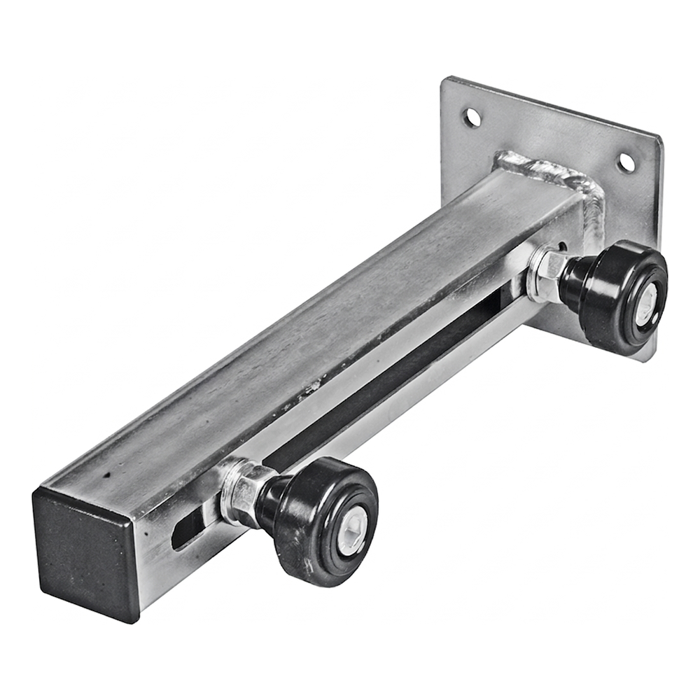 De geleiding is bestemd voor hekken die aan de bovenkant zijn afgewerkt met een gesloten profiel met rechte vorm, zonder uitstekende decoratieve elementen. Het hek schuift tussen twee rolletjes door, die het verticaal houden en zijdelingse bewegingen elimineren. Het geleidingsprofiel is gelast aan een vierkante montageplaat met vier gaten — het element wordt direct aan een gemetselde of stalen paal bevestigd met schroeven (niet bij de set inbegrepen).
