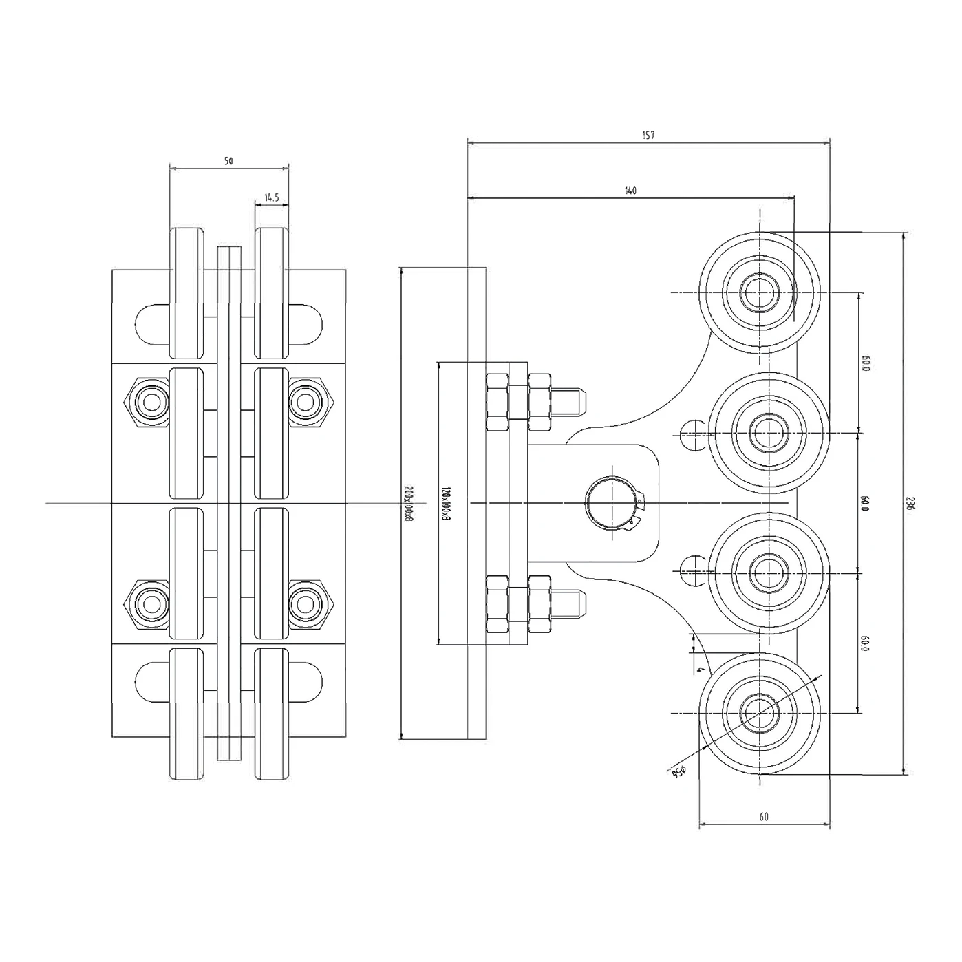 - Rijdende wagen – 2 st. (8 stalen rollen op twee niveaus, kogellagers 6201 RS)