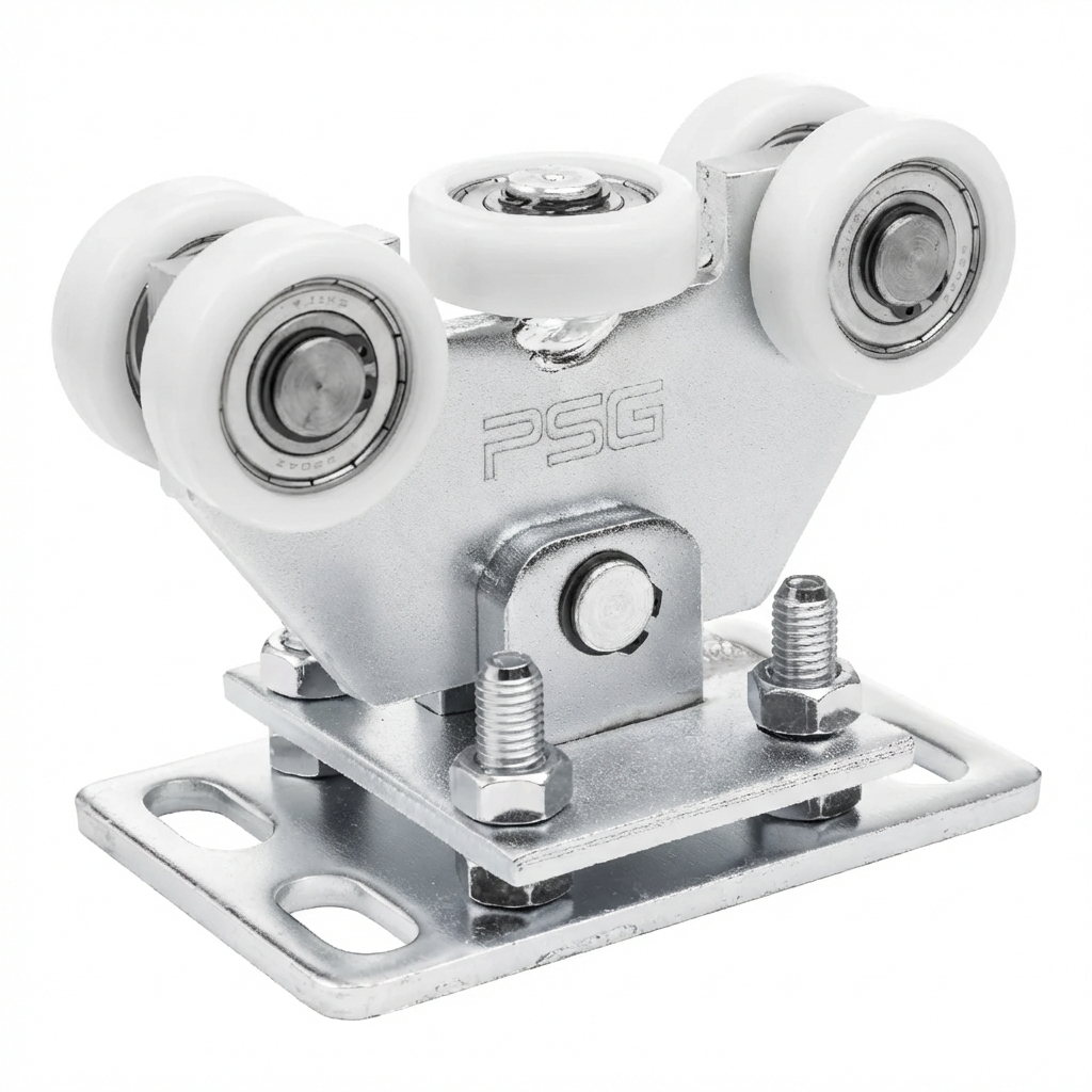 Compleet pakket rijwielen met accessoires – kant-en-klare montageset voor vrijdragende schuifpoorten. De set bevat alles wat u nodig heeft voor de juiste ophanging en stabilisatie van de poort op een rail van 80×80×5 mm: twee rijwielen, een aanrijrol met beschermafsluiting en een aanrijhouder.