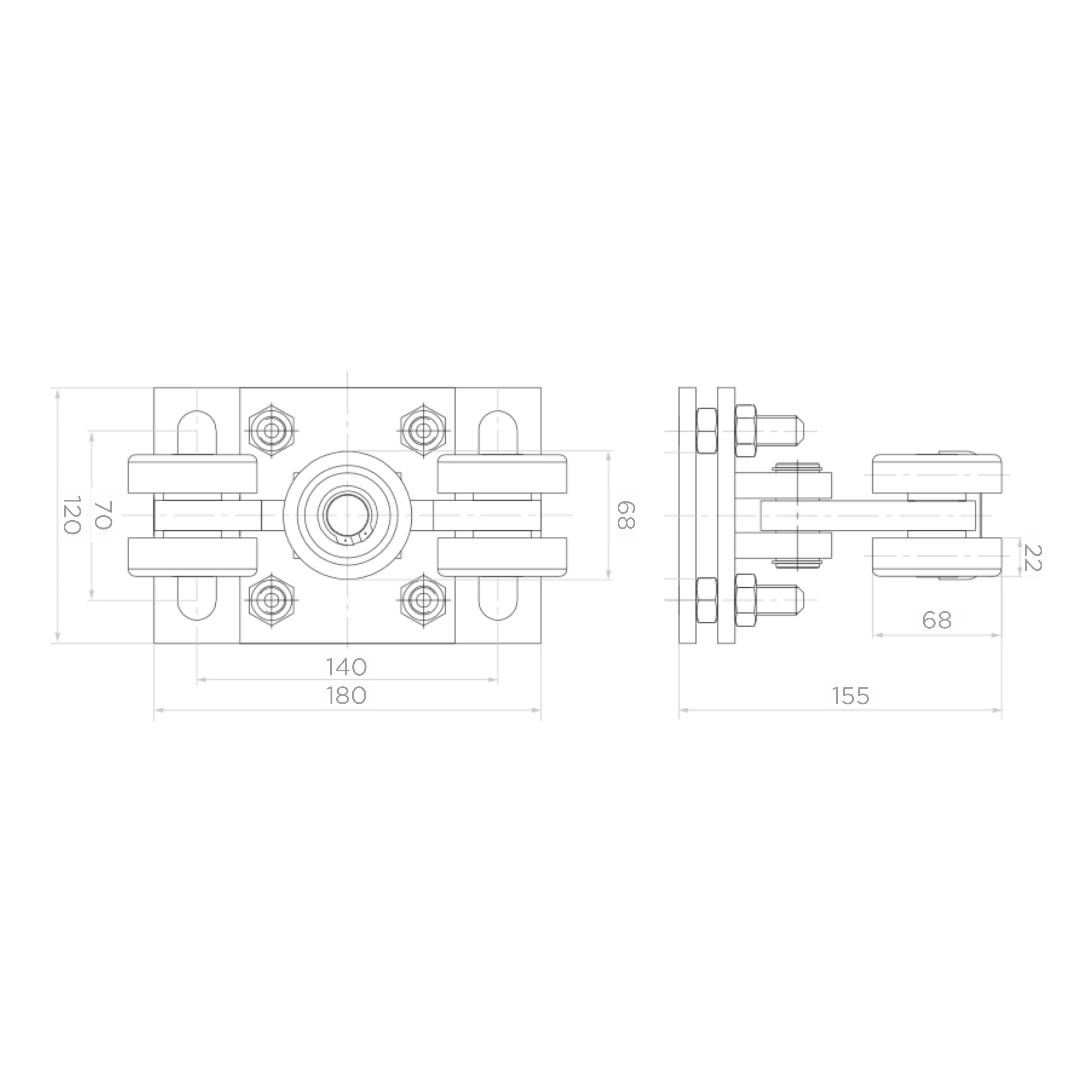 Afmetingen rijwiel: basisplaat 180×120 mm, bevestigingsafstand 140×70 mm, totale hoogte 155 mm, breedte rollen 68 mm.