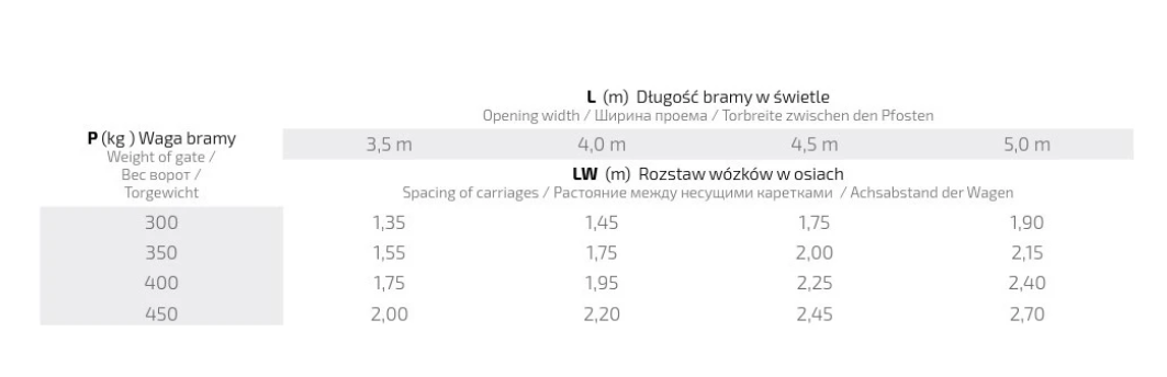 Bepaling van de rijwielafstand – de juiste hartafstand tussen de rijwielen is afhankelijk van het gewicht van de poort en de breedte van de doorgang in het licht. Voor poorten met een gewicht van 300 kg en een doorgang van 3,5 m bedraagt de afstand 1,35 m, terwijl voor poorten met een gewicht van 450 kg en een doorgang van 5,0 m de afstand oploopt tot 2,70 m. Gedetailleerde waarden voor alle combinaties zijn te vinden in de technische tabel.