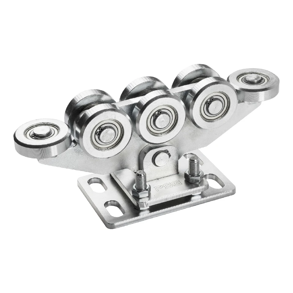 De wagen is uitgerust met 8 stalen rollen, waarvan twee horizontale, voor een gelijkmatige lastverdeling en een soepele poortbeweging. De zwenkende constructie – de wagen is via een pen verbonden met de voetplaat – zorgt voor automatische aanpassing aan de poortgeleider. De hoogteverstelling verloopt via stelschroeven, wat een nauwkeurige afstelling tijdens de montage vergemakkelijkt. Het maximale belasting van één wagen bedraagt 1000 kg.