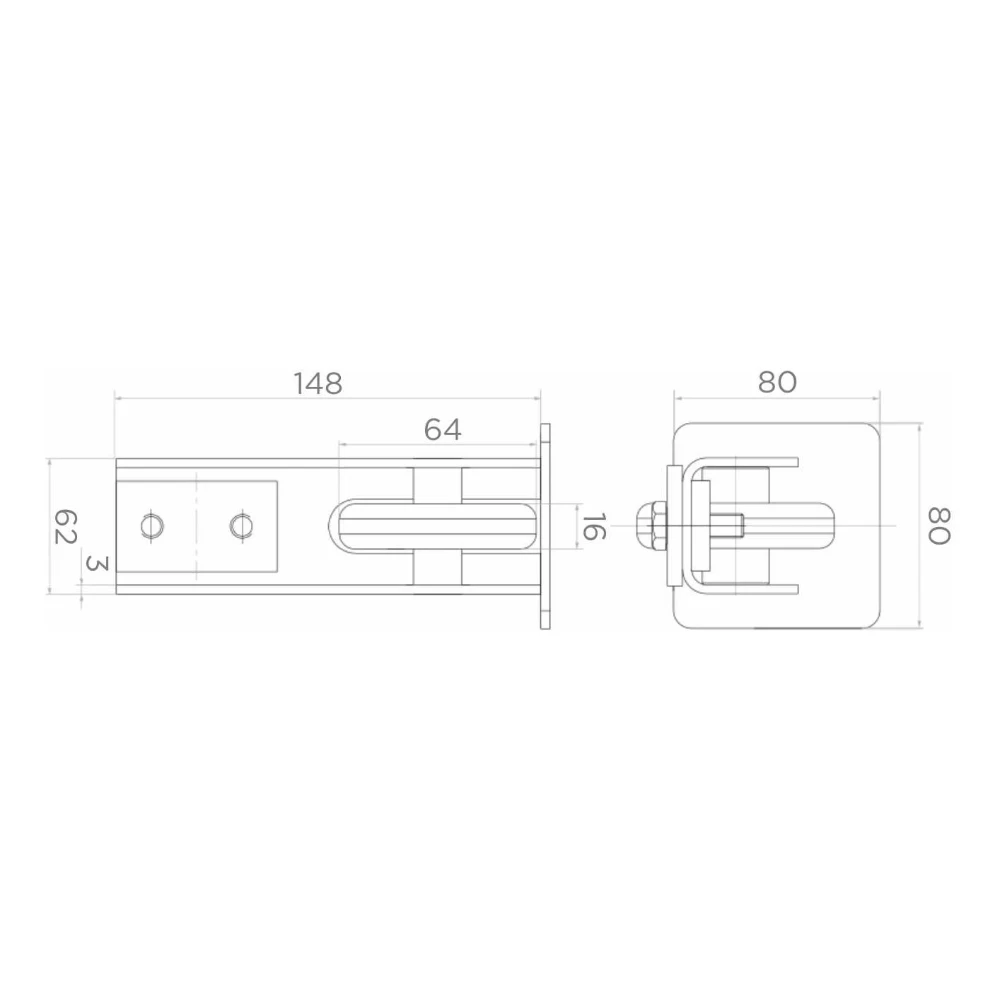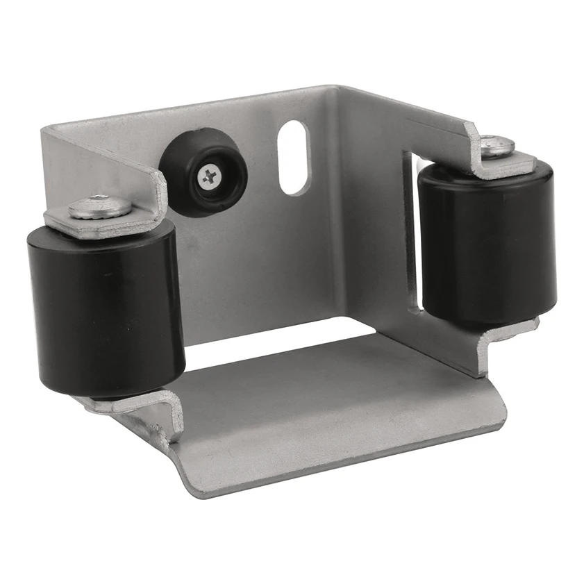 De stalen aanrijbeugel vervult een dubbele functie: stabiliseert de poort na sluiting en verdeelt het gewicht over meer steunpunten, wat de levensduur van de rijdende wagens aanzienlijk verlengt. Uitgerust met twee kunststof geleidingsrollen (hart-op-hart afstand 88 mm), die de poortgeleider begeleiden tijdens het sluiten. Op de achterwand bevinden zich twee montagegaten en een rubberen stootbuffer die trillingen dempt.