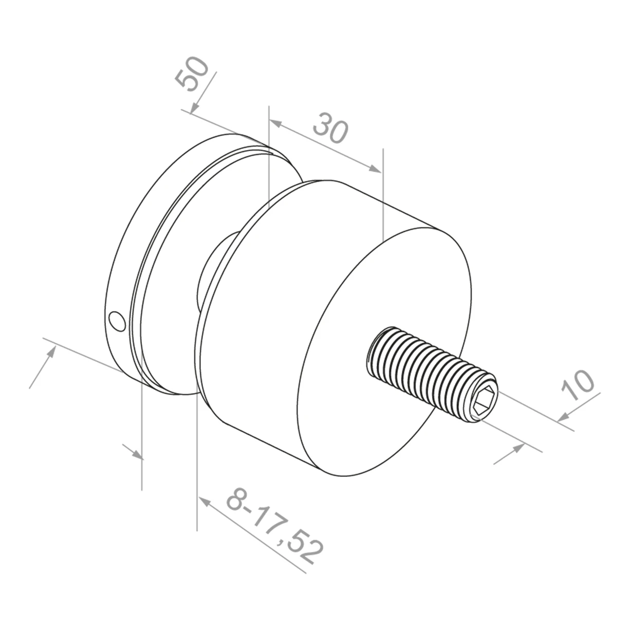 De rotula bevestiging met een diameter van 50 mm maakt bevestiging mogelijk van glasplaten met een dikte van 8 tot 17,52 mm, wat zowel enkele ruiten als gelamineerd glas omvat. De montagedraad M10×70 garandeert een stabiele en veilige verbinding met de ondergrond, en het montagegat van 18 mm diameter vergemakkelijkt precieze positionering tijdens installatie. De afstand van 30 mm vanaf het montageoppervlak geeft de constructie visuele lichtheid en zorgt voor de juiste afstand tussen glas en muur of zuil.