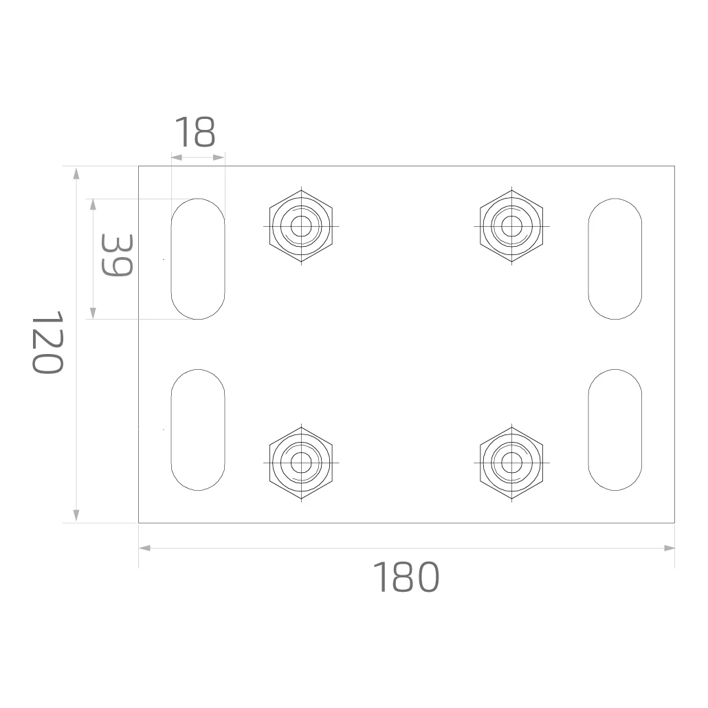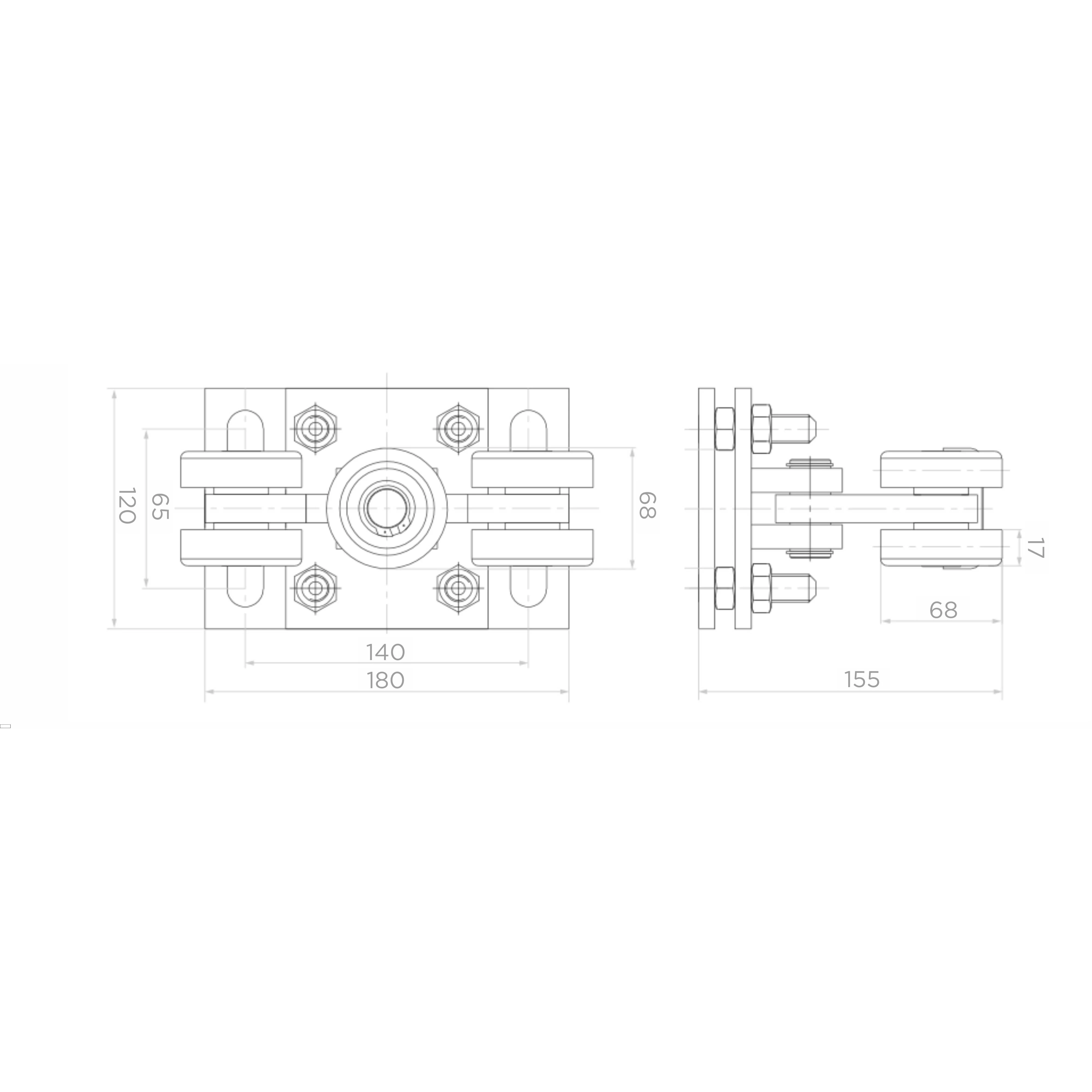 De montageplaat met afmetingen 180×120 mm heeft langwerpige gaten (18×39 mm) die de positiebepaling van de rijwagen tijdens bevestiging aan het fundament vergemakkelijken. De rollenafstand bedraagt 140 mm in de lengterichting en 68 mm in de dwarsrichting, en de totale diepte van de rijwagen inclusief rollen is 155 mm.