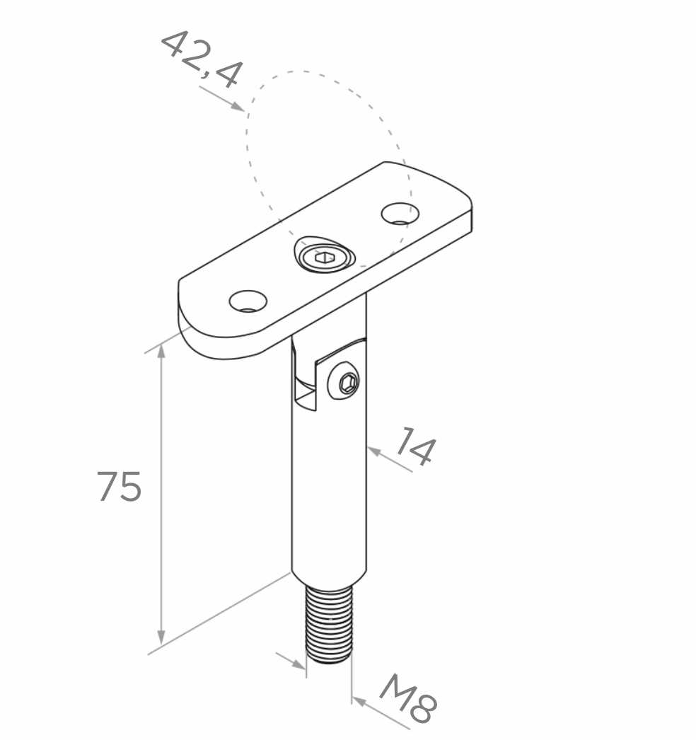 De scharnierstang bestaat uit een cilindrische pin met diameter 14 mm en hoogte 75 mm, afgesloten met buitenschroefdraad M8 voor inschroeven in paal of draagend element. Het bovenste deel is uitgerust met een geprofileerde montageplaat aangepast aan buis met diameter 42,4 mm, met montagegaten die stevige bevestiging van de leuning mogelijk maken. De scharnierverbinding beveiligd met inbusschroef maakt het mogelijk de gewenste hoek in te stellen, en na vastdraaien zorgt voor stabiele en duurzame positiebehoud.